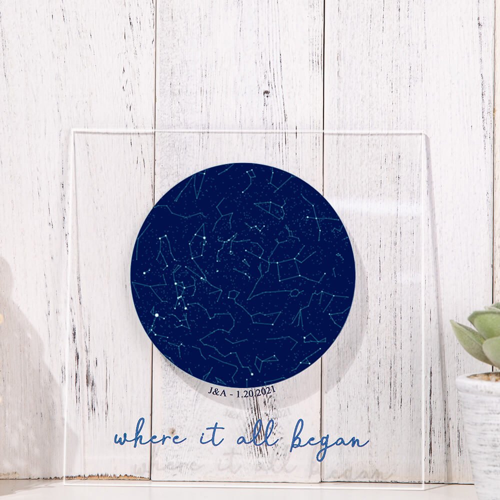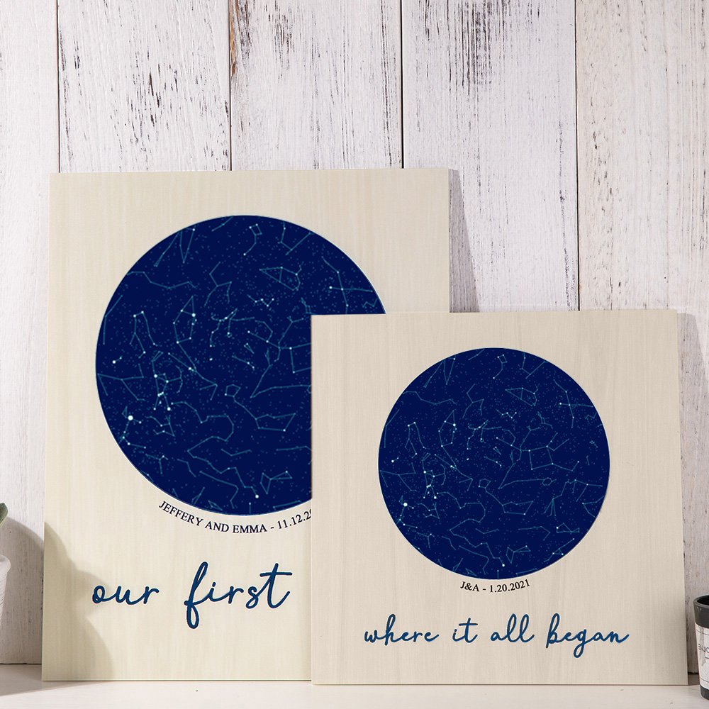 •Carte du ciel conçue pour que les couples se souviennent du jour spécial de leur voyage amoureux. Façon romantique d'enregistrer la constellation de ce jour et de cet endroit. Sous le dôme, votre amour est dans l'air. Cadeau unique pour votre bien-aimé.