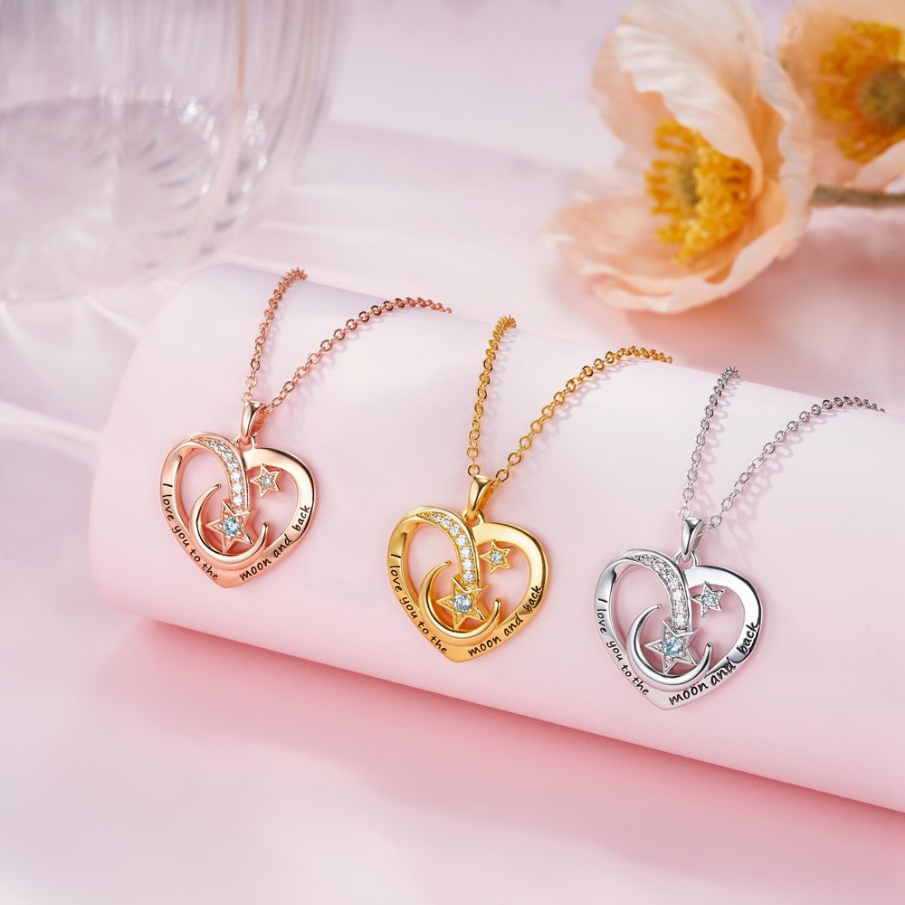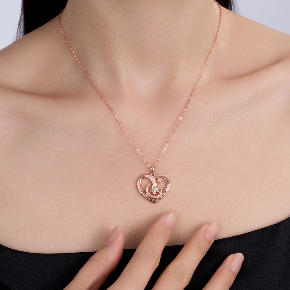 Le pendentif de notre collier présente un contour en forme de cœur et est orné de lunes, d'étoiles et de zircons étincelants pour créer un amour éternel et doux. Vous pouvez personnaliser le nom et la pierre de naissance du destinataire et les associer au pendentif en forme de cœur pour créer un bijou unique et élégant.