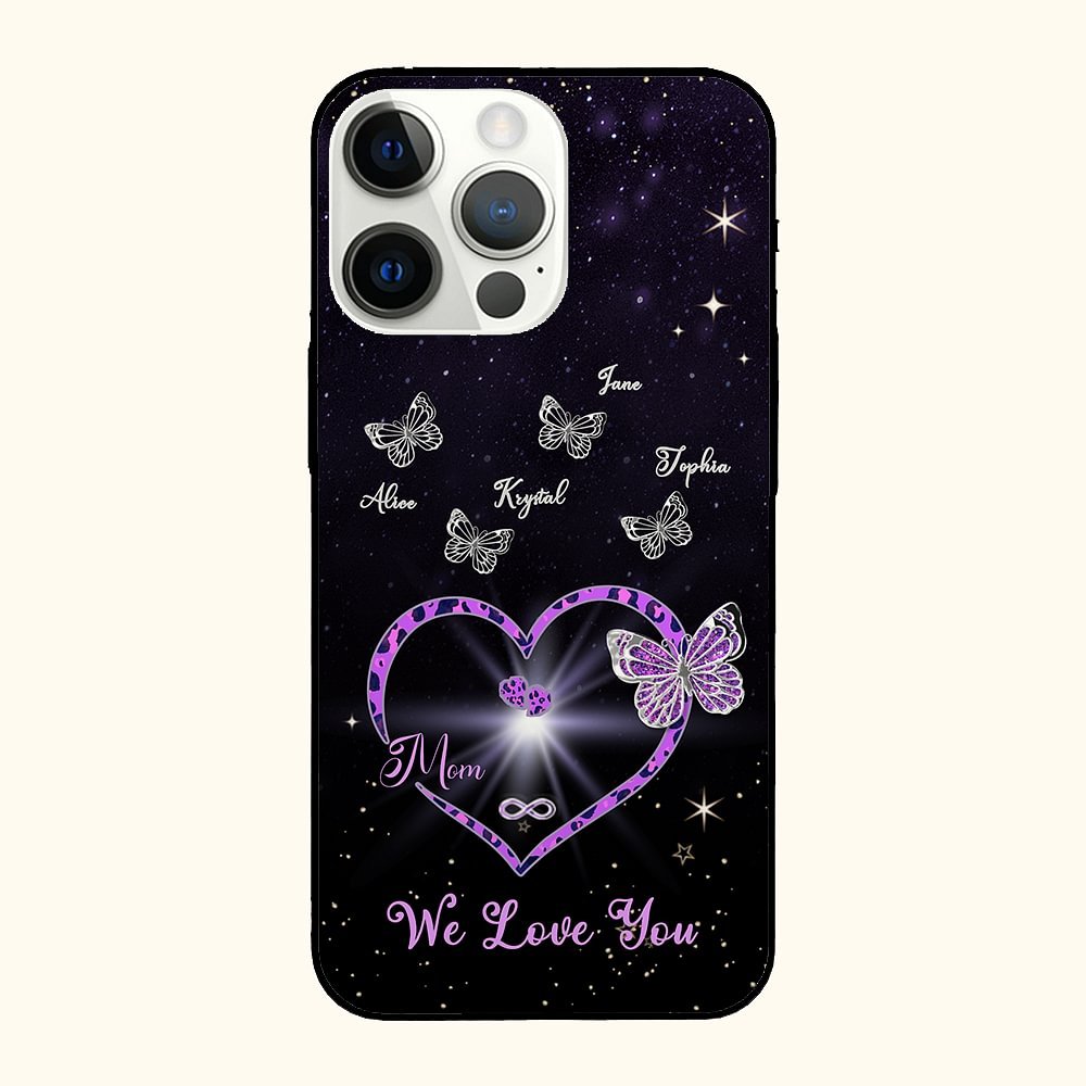 This phone case is designed with a starry sky as the background, with different metallic colors of heart patterns as well as butterflies, the picture is very dreamy. You can add the number of butterflies and their names with the slogan "I/We love you" to create a personalized and precious gift for the recipient, conveying endless care and blessings that will be cherished and cared for.