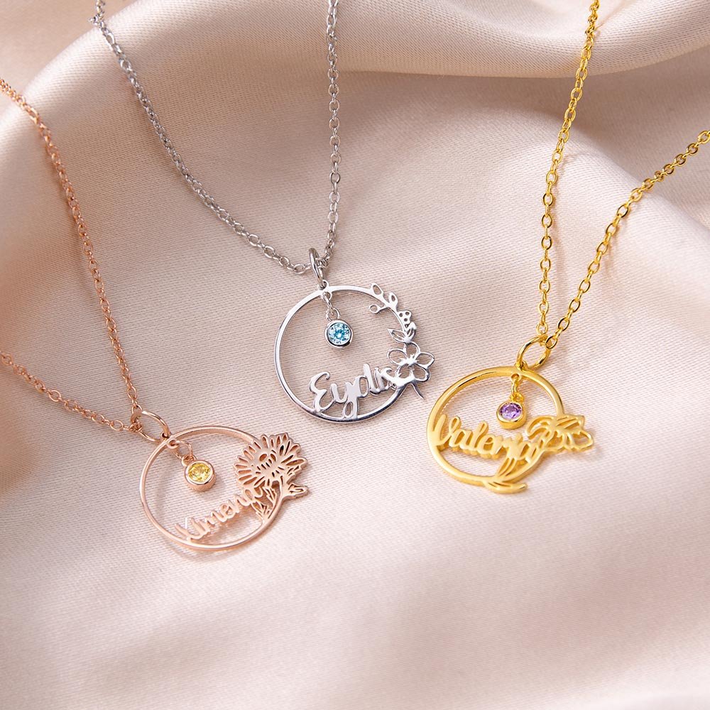 Il s'agit d'un collier délicat et simple que vous pouvez personnaliser avec votre pierre de naissance, votre fleur de naissance et votre nom, ce qui en fait un cadeau d'anniversaire unique.