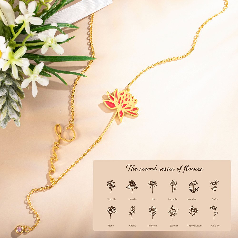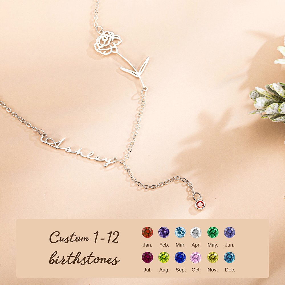 Collier Personnalisé avec Pierre de Naissance Nom et Fleur Cadeau d'Anniversaire Fête des Mères pour Mère Femme