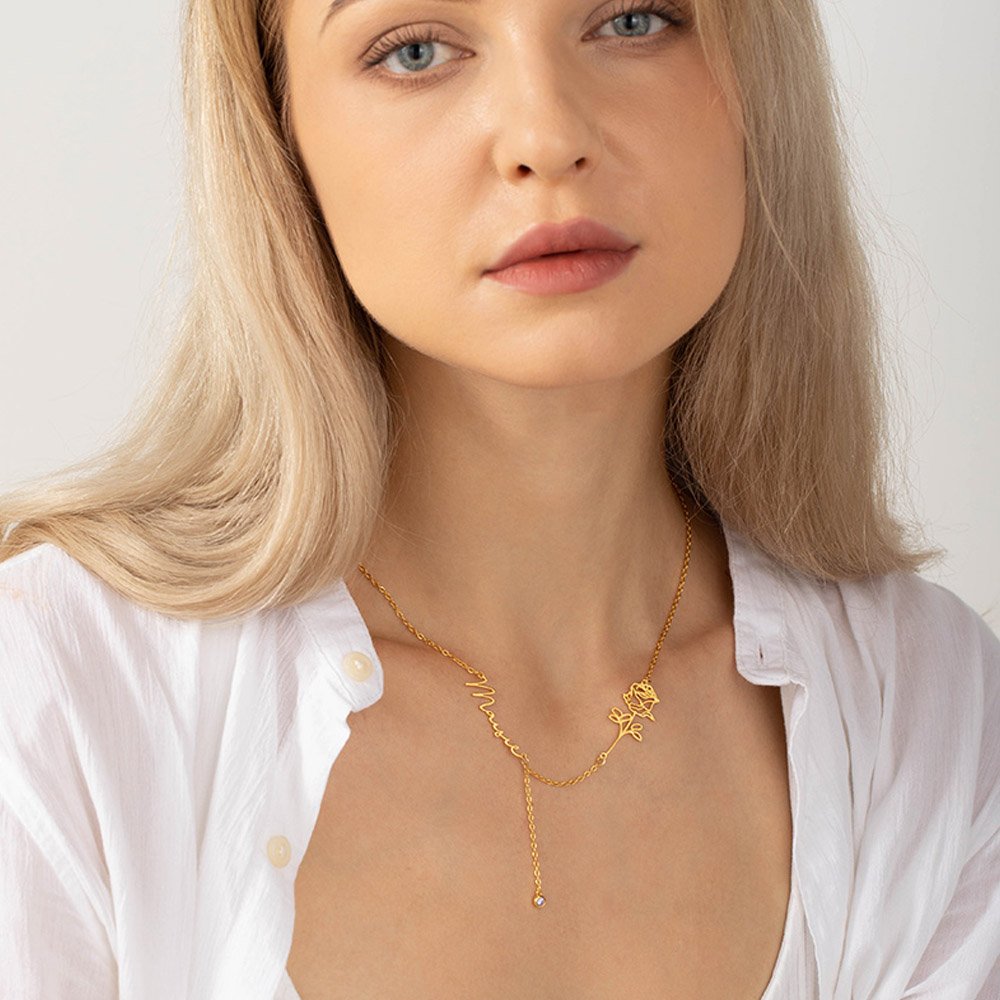 Ce collier est personnalisé avec le nom, la pierre de naissance et la fleur de naissance de votre proche, ce qui en fait un cadeau unique qu'il chérira pendant des années. Le pendentif est gravé de manière experte avec le nom de l'être cher et un magnifique motif floral qui inclut sa fleur de naissance. Le collier est complété par une magnifique breloque de pierre de naissance, qui ajoute une touche de couleur et de personnalisation.
