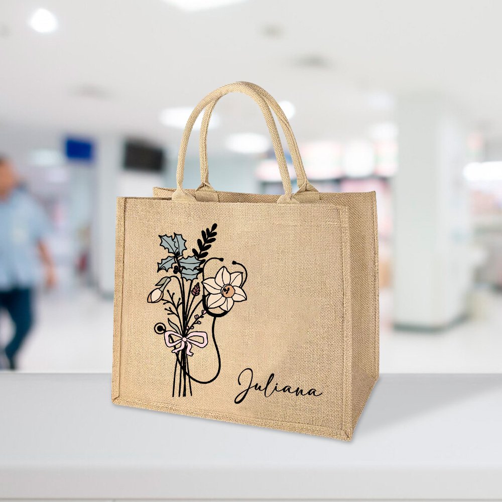Ce sac fourre-tout en toile de jute a un design nouveau et unique, combinant astucieusement trois éléments : une fleur de naissance, un nœud et un stéthoscope, ce qui est à la fois élégant et professionnel. Vous pouvez imprimer votre nom ou celui de votre ami sur le devant, ce qui est une façon d'exprimer votre personnalité et de respecter leur engagement dans le domaine de la santé.
