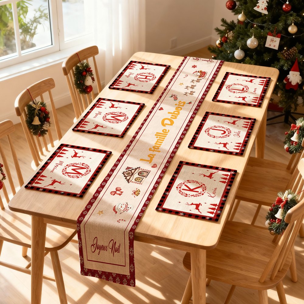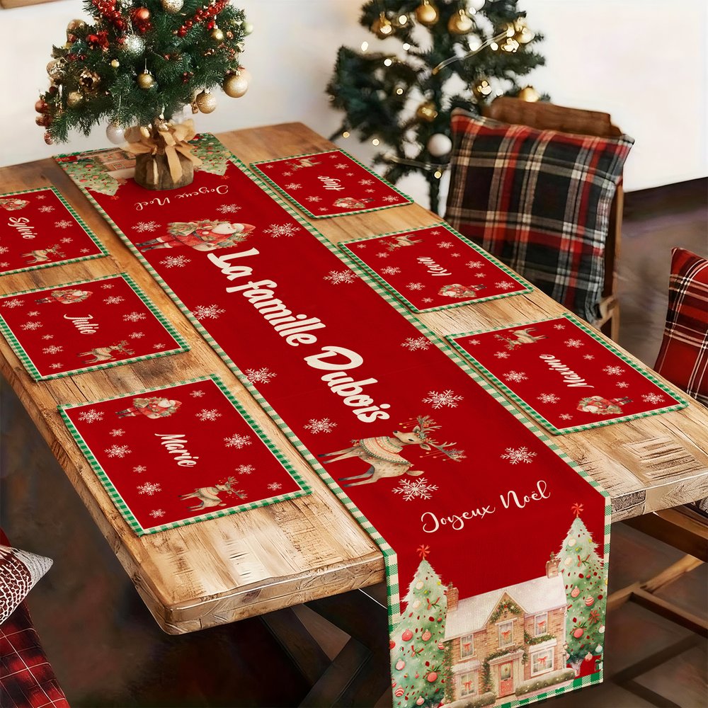 Avec ses icônes de Noël classiques comme le Père Noël, les rennes et les flocons de neige, cet ensemble de nappes plonge votre maison dans une ambiance festive. Le chemin de table et les sets de table peuvent être personnalisés avec votre nom de famille, les noms des membres ou des vœux de Noël, transformant ainsi chaque dîner de famille ou réunion d'amis en une célébration de Noël unique et significative.