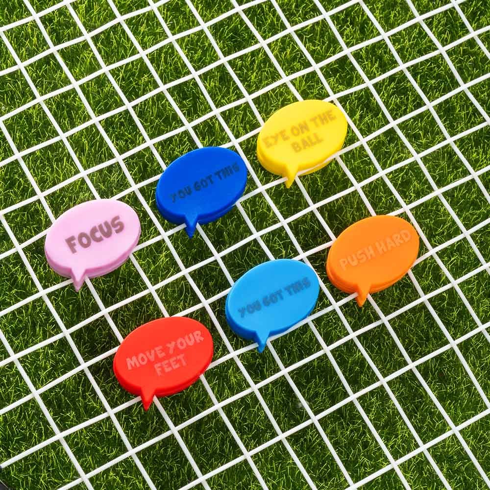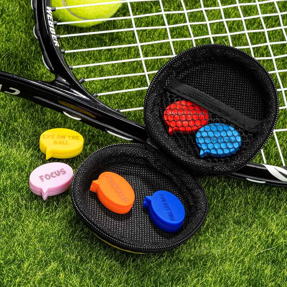 Ces amortisseurs de tennis ont une forme unique de boîte de dialogue, ajoutant une touche amusante et créative à votre équipement de tennis. Chaque amortisseur peut être personnalisé avec des citations inspirantes ou des dictons motivants pour stimuler le moral et la confiance des joueurs pendant les moments cruciaux du match.