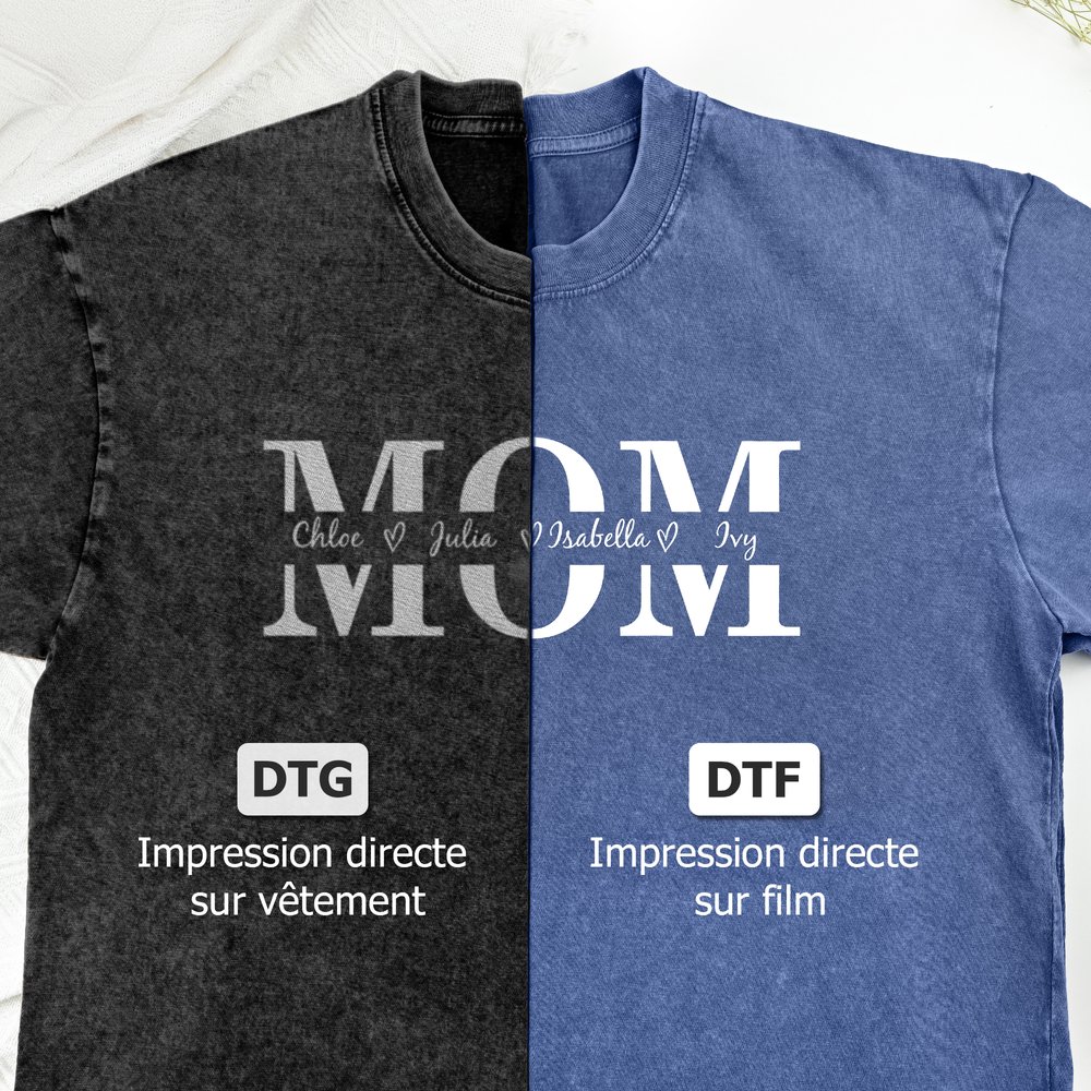 Ce t-shirt sur le thème de la fête des mères présente un motif "MOM" audacieux et réfléchi, que vous pouvez personnaliser avec les noms de vos enfants nichés entre des symboles en forme de cœur. Vous pouvez également choisir le mot "MOM" dans la langue de votre choix et sélectionner plusieurs couleurs de vêtement. Nous proposons deux méthodes d'impression professionnelle : L'impression DTG, qui est douce et respirante et donne l'impression de faire partie du tissu, et l'impression DTF, qui est brillante et durable et fait ressortir davantage les couleurs. Chaque chemise devient un hommage unique à l'amour maternel.