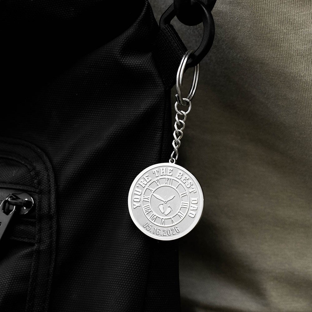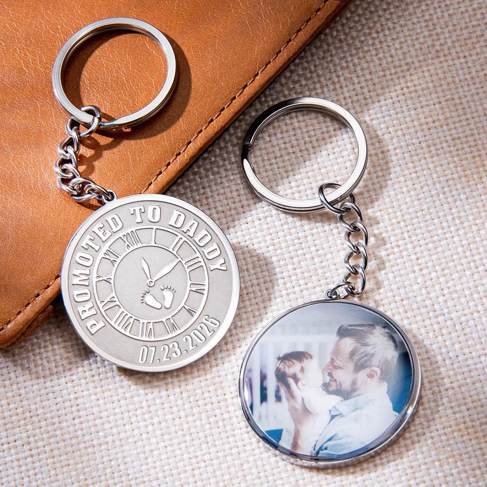 Vous pouvez personnaliser les détails de la naissance du bébé, y compris l'heure et la date de naissance sur le devant de la pièce. Le contenu de la partie ronde extérieure est personnalisable, et le milieu du disque comporte par défaut une empreinte de bébé. Vous pouvez également choisir le style du contenu au dos (soit une photo imprimée, soit un texte gravé). Ce porte-clés sera unique par rapport aux autres porte-clés dans le monde.