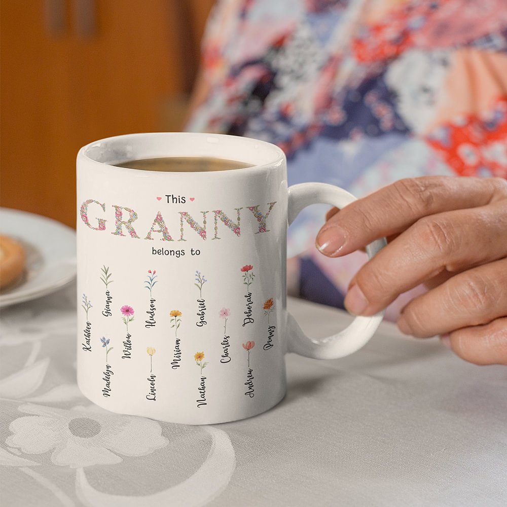 Chaque tasse en céramique personnalisée comporte l'adorable citation "Cette grand-mère/maman appartient à", suivie des noms des membres de la famille et des fleurs de naissance correspondantes. Avec la possibilité de personnaliser la tasse avec 1 à 16 fleurs de naissance et noms, vous pouvez créer un hommage unique qui met en valeur les liens familiaux les plus chers.