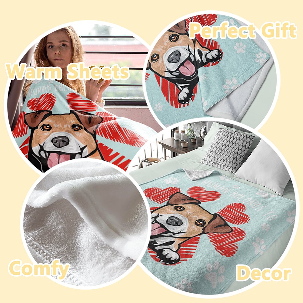 With the funny quote "This Human Belong To," this blanket adds a special touch to celebrate the bond between pet owners and their furry friends. What truly sets this blanket apart is the option to customize it with your pet's name and a cute cartoon character. Designed exclusively for this blanket, the lovable character captures the playful and affectionate nature of our beloved companions.