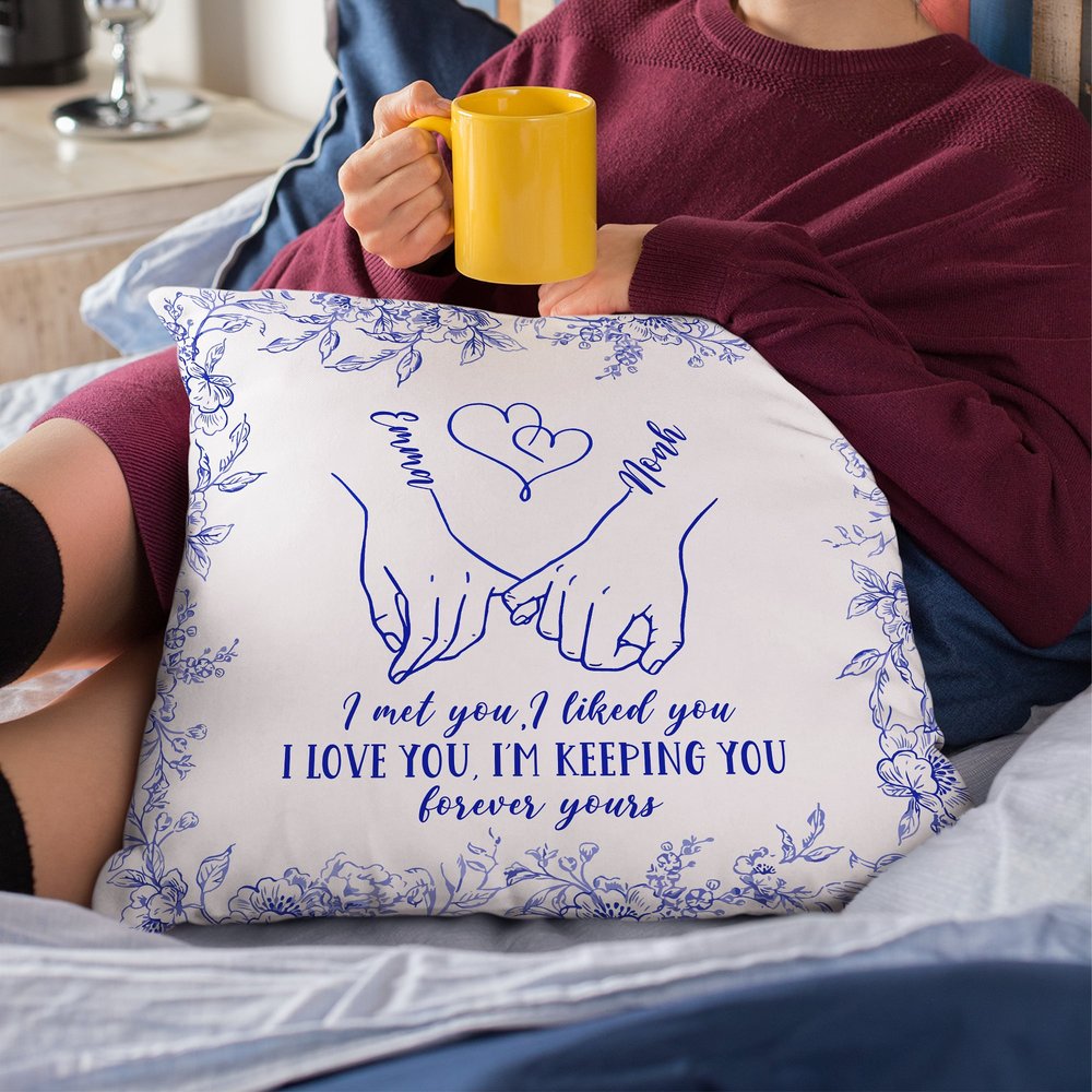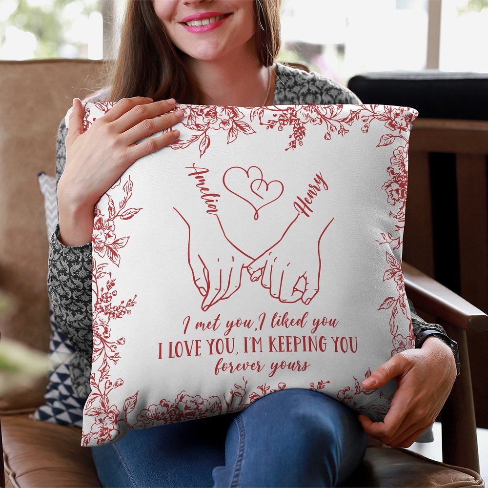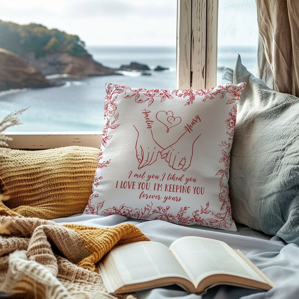 Ce coussin de couple personnalisé, inspiré de la classique Toile de Jouy, apporte le charme élégant de la romance française dans la vie de tous les jours. Le dessin simple mais affectueux de mains entrelacées au centre, surmonté d'un motif en forme de cœur, ajoute une touche d'amour. Personnalisable avec les noms du couple, ce design offre à la fois une esthétique vintage et une touche unique, créant ainsi une véritable pièce de narration pour n'importe quel espace.