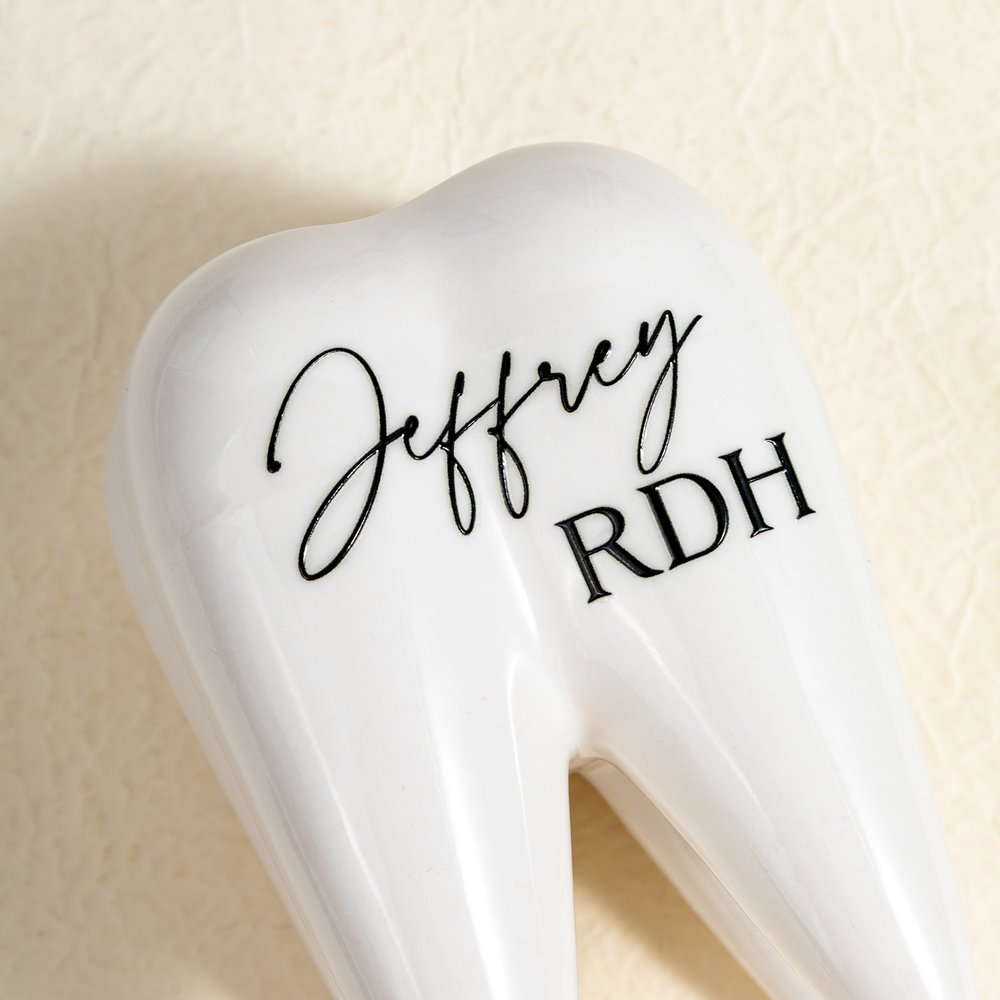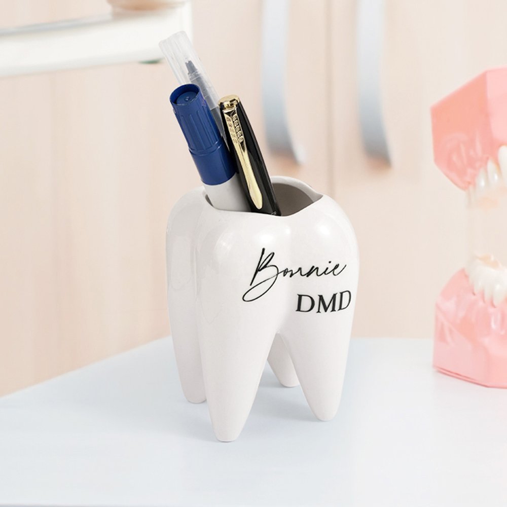 Ce porte-crayon dentaire en céramique est le complément idéal du bureau ou de l'espace de travail de tout professionnel de la santé dentaire ! Non seulement il peut être personnalisé avec votre nom, mais vous pouvez également y ajouter votre diplôme de dentiste pour en faire une pièce unique.