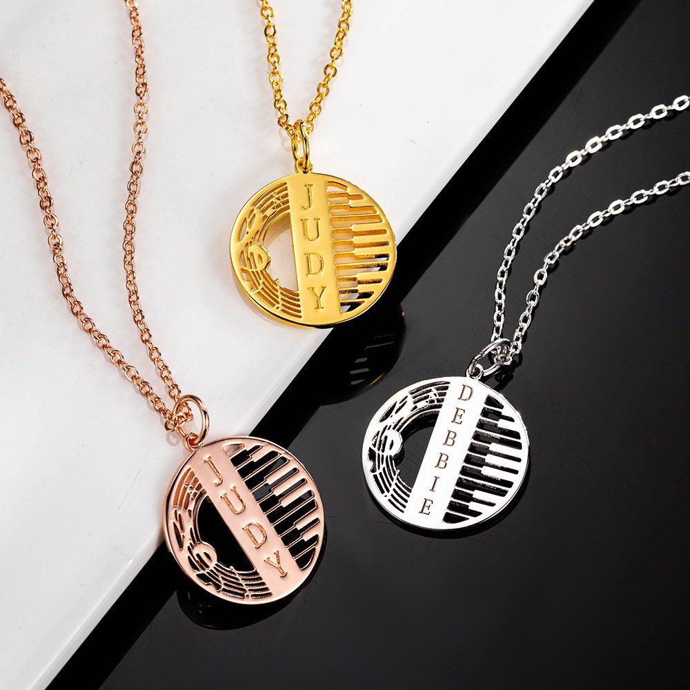 Conçu avec des symboles de clé de sol et des touches de piano, ce pendentif peut être personnalisé au centre avec un nom ou un autre message. Ce pendentif est un cadeau parfait pour les amateurs de musique ou les professeurs en raison de sa simplicité exquise et de son sens du design.