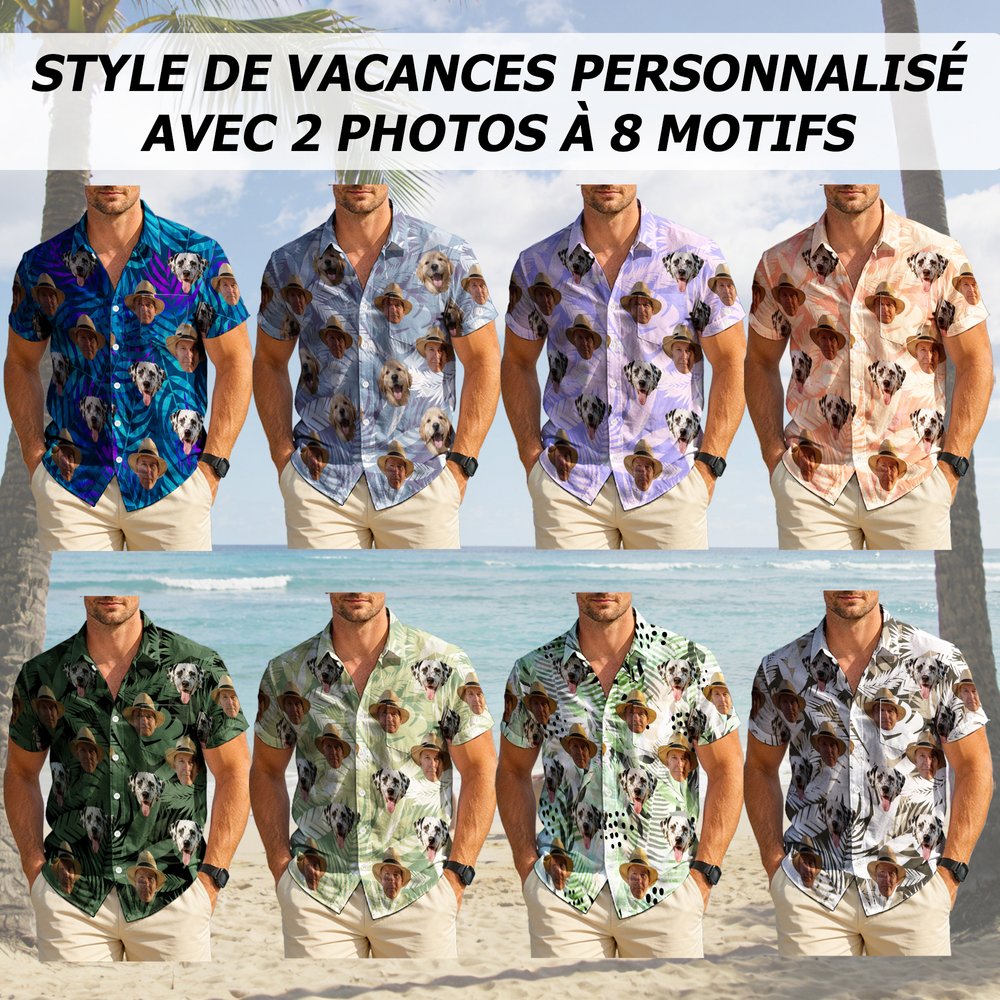 Téléchargez 1 à 2 photos de votre enfant, de votre animal de compagnie ou de toute autre personne que vous souhaitez imprimer, associez-les à des arrière-plans sur le thème des feuilles tropicales et obtenez un tee-shirt d'été unique. Que ce soit pour un séjour à la plage ou une fête tropicale, cette chemise personnalisée vous permettra de vous démarquer grâce à des éléments personnels uniques.