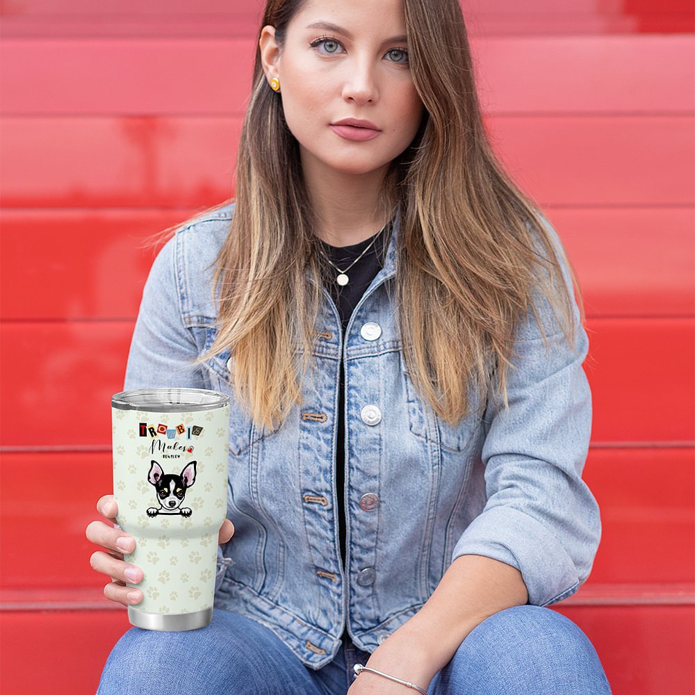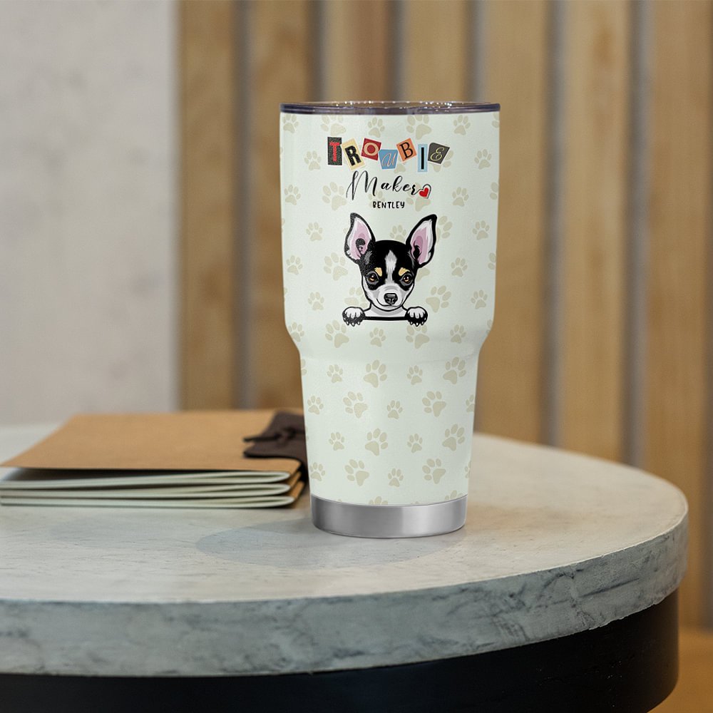 This 30oz tumbler features a humorous and personalized message: "Trouble maker / Double Trouble / Triple Trouble / Quadruple Trouble / Quintuple Trouble / Sextuple Trouble" The witty phrase adds a playful touch and makes it a delightful gift for pet lovers with a sense of humor.