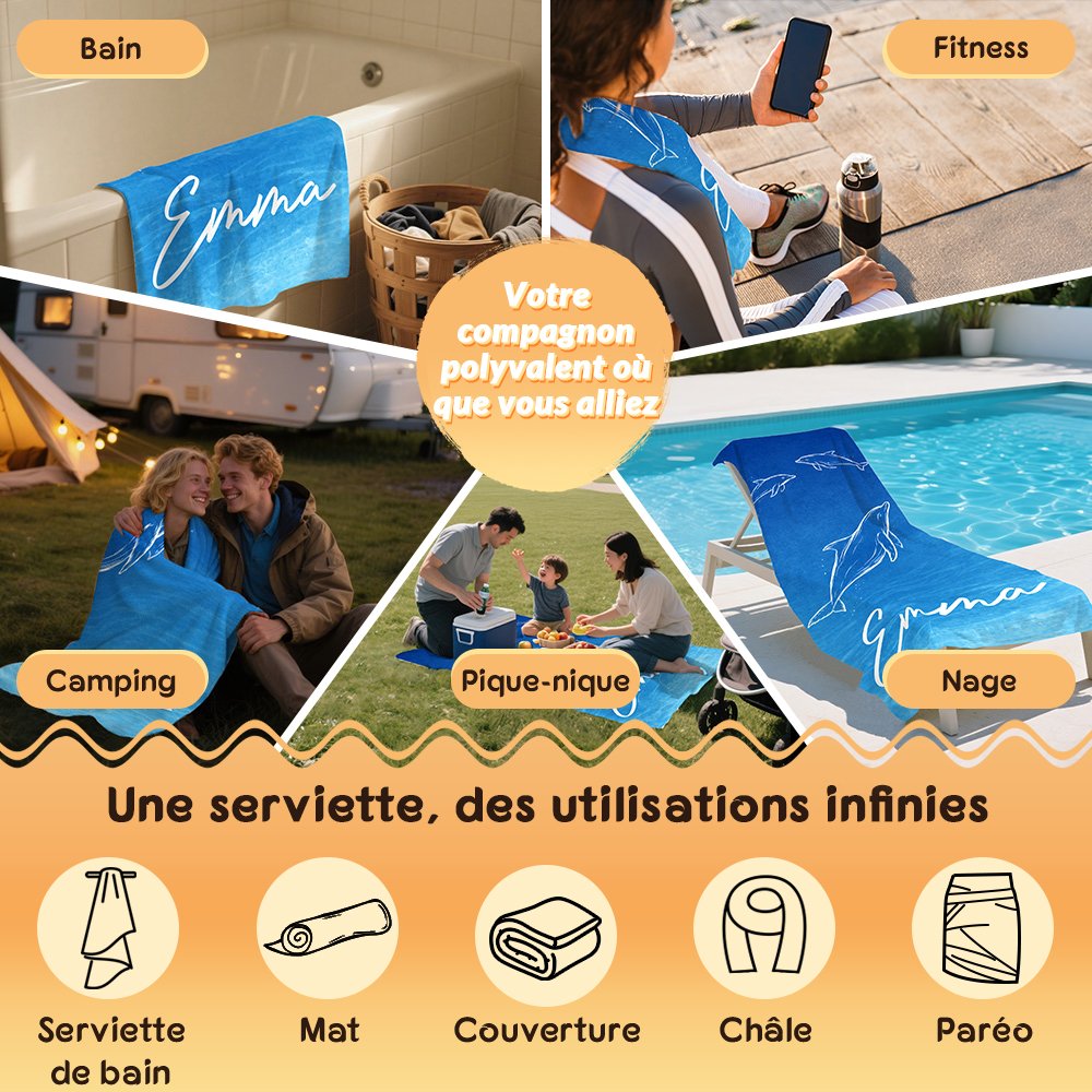 Serviette de plage personnalisée avec nom et motif d'animal marin Accessoire à séchage rapide Cadeau d'anniversaire pour les amis et la famille