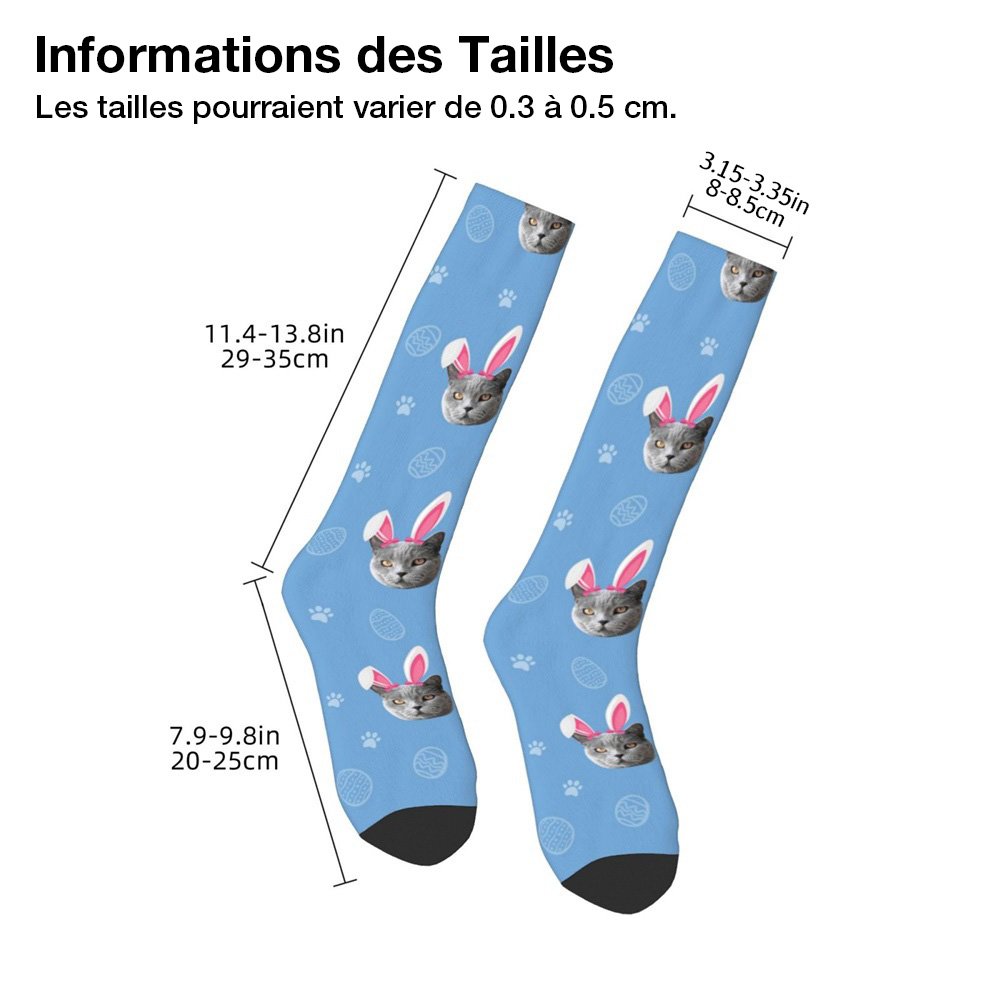 Des oreilles de lapin roses sont ajoutées au sommet de la photo pour créer un aspect ludique et charmant. Les photos de vos enfants, de votre famille, de vos amis ou de vos animaux de compagnie peuvent être joliment imprimées sur les chaussettes, ce qui en fait un cadeau unique et personnalisé.
