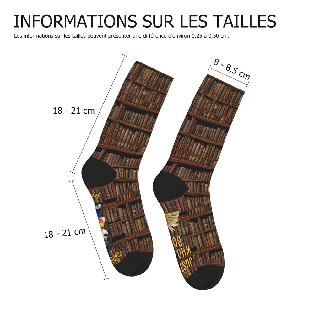 Avec la lecture comme thème central, ces chaussettes présentent un design rétro de bibliothèque, créant l'illusion d'une bibliothèque miniature à vos pieds. Les étagères bien rangées, associées à un personnage de bande dessinée lisant attentivement, illustrent parfaitement la tranquillité et la beauté de la lecture. De plus, les chaussettes sont personnalisables à votre nom, ce qui en fait plus qu'un simple vêtement : elles deviennent un symbole unique de votre personnalité et de votre passion pour la lecture.