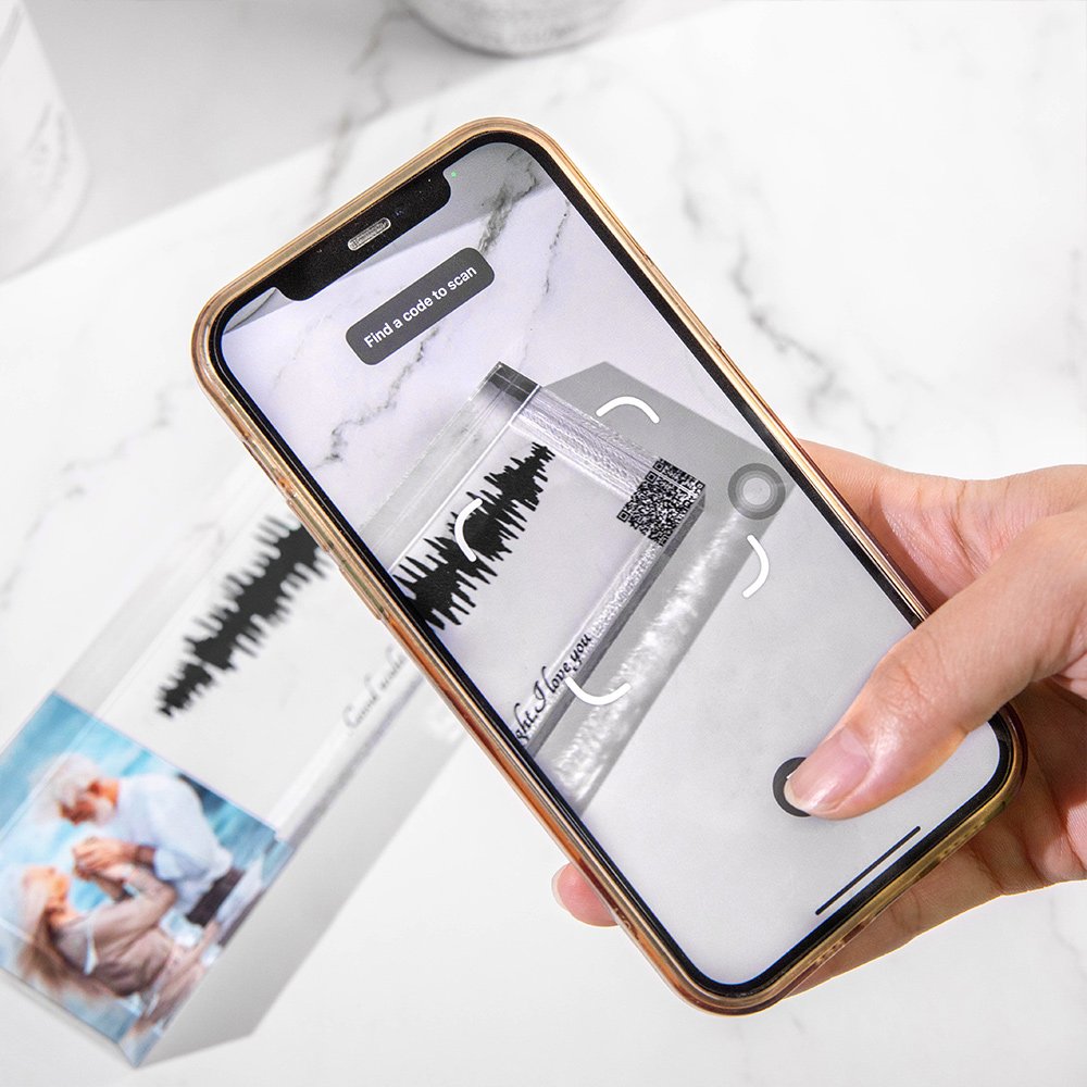 La décoration en verre d'art sonore créative est aussi unique que votre voix, avec du texte, des photos et des ondes sonores personnalisables, scannez le code QR ci-dessus pour entendre votre enregistrement ou votre chanson préférée, tous les deux codes Dimension sont pleins de souvenirs heureux et chaleureux. Posez-les sur votre bureau ou dans votre salon, vous pourrez regarder les photos ci-dessus, écouter leurs voix ou leurs chansons, et vous remémorer le bon vieux temps.