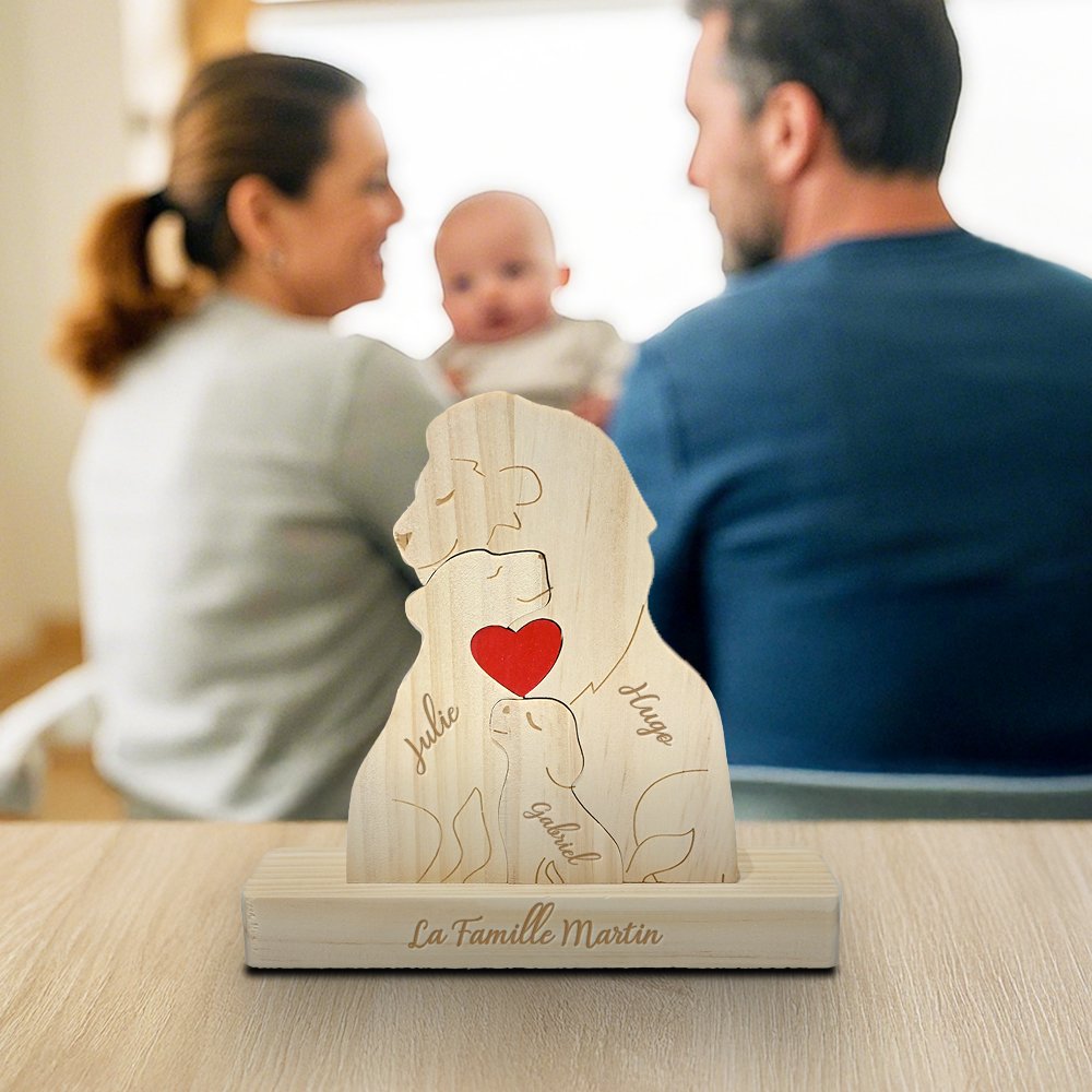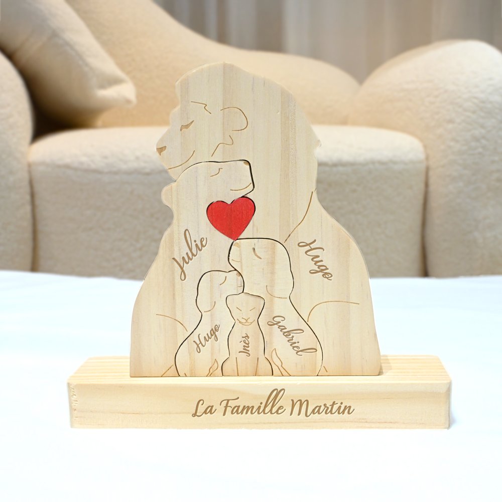 Ce puzzle comporte des pièces en forme de lion soigneusement travaillées, représentant une famille de lions se serrant l'un contre l'autre, avec un cœur d'amour rouge au milieu, montrant l'unité et la cohésion de la famille, et incarnant également le véritable sens des retrouvailles. Le motif est à la fois artistique et significatif, et vous pouvez personnaliser de 2 à 7 noms. Il s'agit non seulement d'une pièce décorative, mais aussi d'un rappel permanent de l'amour et du soutien apportés par votre famille.