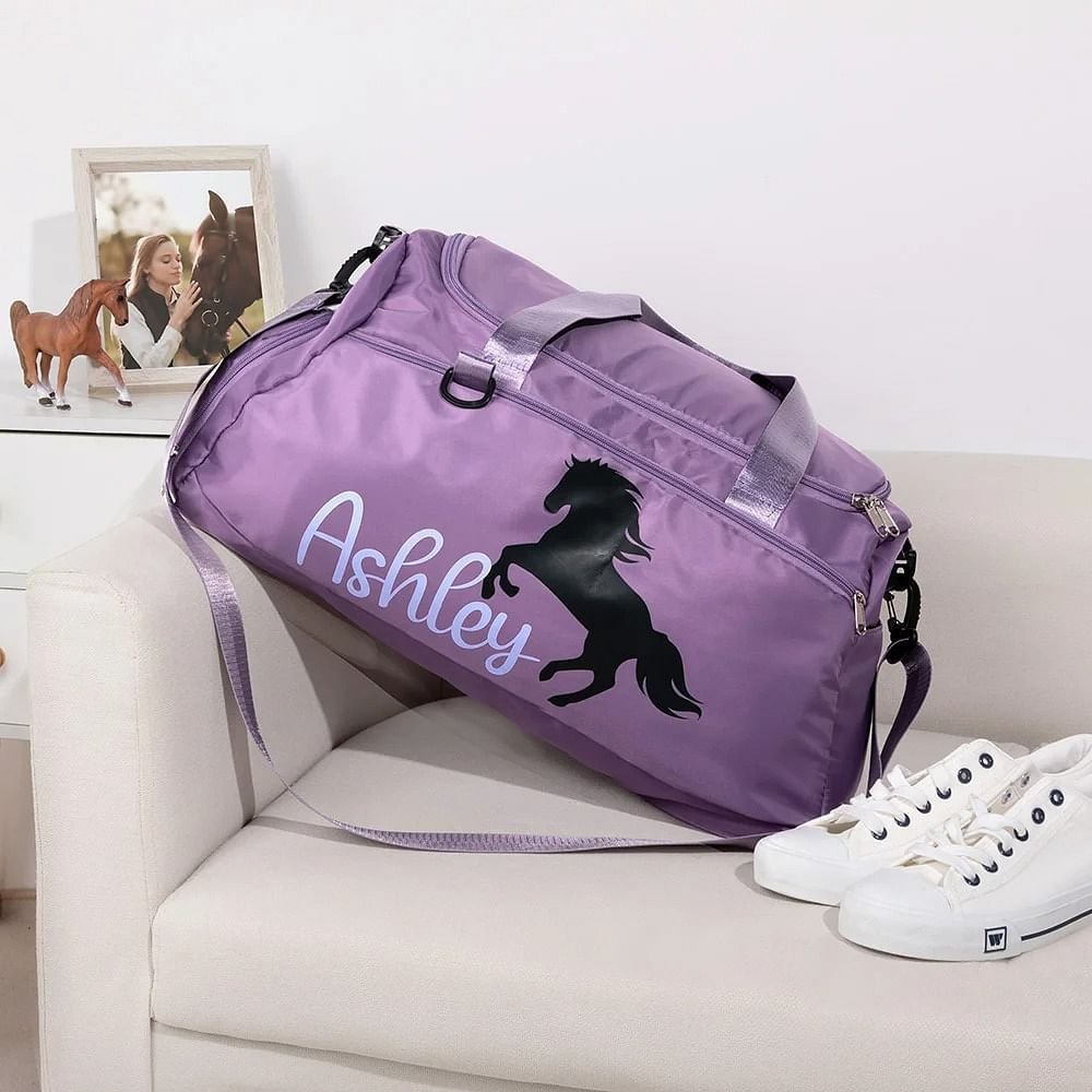 Avec la silhouette d'un cheval imprimée sur le devant, notre sac de voyage est un accessoire élégant pour tous ceux qui aiment les chevaux. Vous pouvez choisir parmi cinq couleurs de sac et ajouter votre propre nom ou celui de quelqu'un d'autre sur notre sac. Nous offrons une variété de styles de polices et de couleurs parmi lesquels vous pouvez choisir, garantissant que vous pouvez associer un produit unique avec le style le plus personnel.