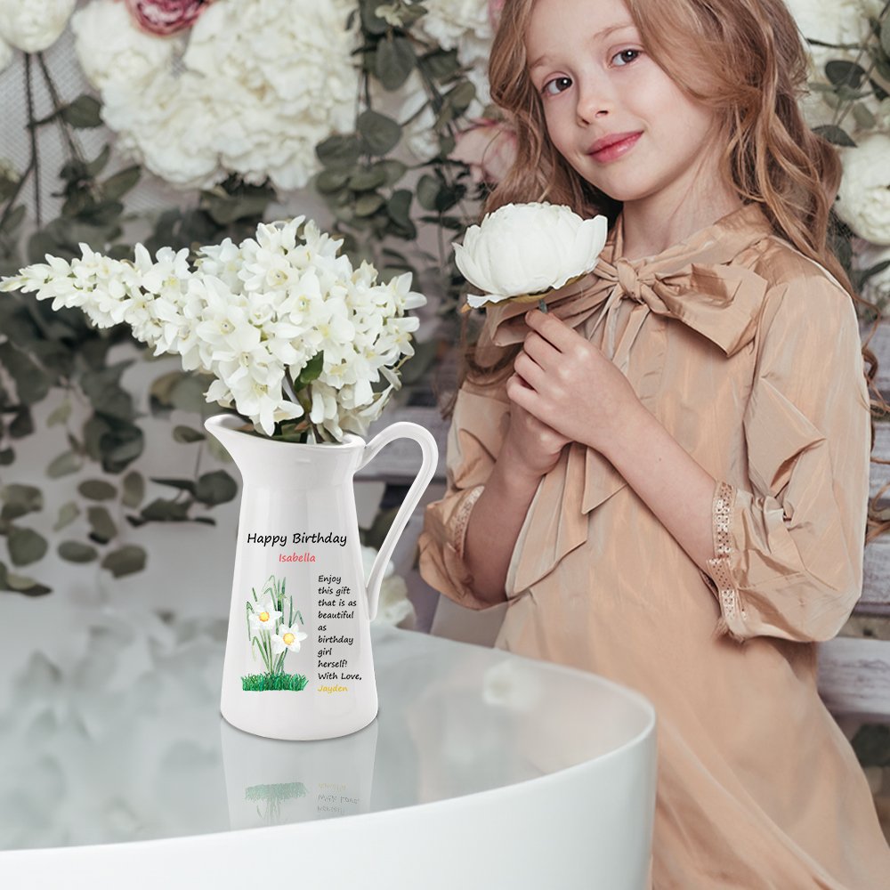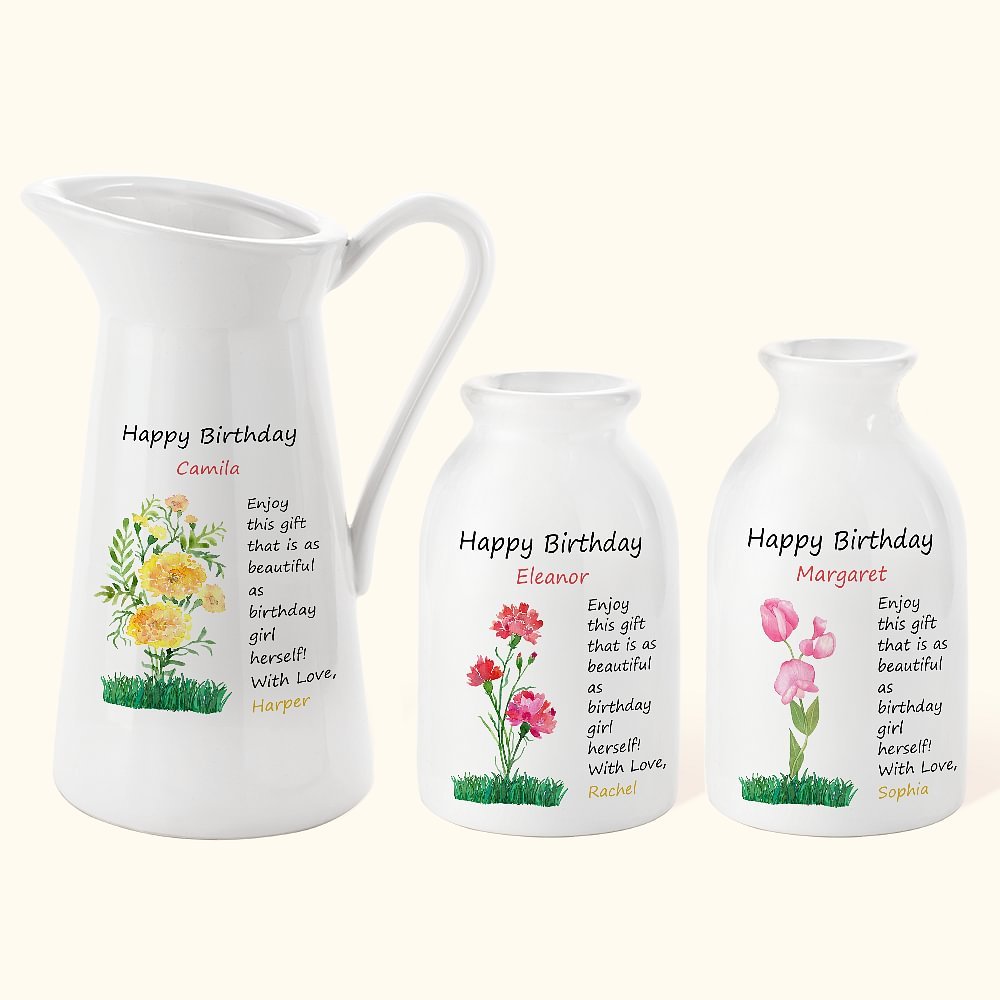 Notre vase exquis en céramique avec des fleurs de naissance est un cadeau unique et sincère pour la fête des mères. Le vase est imprimé avec des fleurs de naissance vives, et vous pouvez personnaliser une fleur de naissance et les noms du destinataire et de l'expéditeur pour faire une bénédiction complète pour votre bien-aimé, exprimant votre gratitude à votre famille. Le mot "Appréciez ce cadeau qui est aussi beau que la fille qui fête son anniversaire" est imprimé sur le vase.