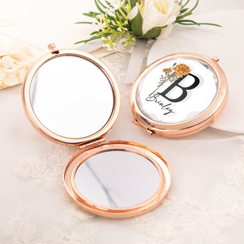 Notre miroir de maquillage compact est conçu avec une belle fleur de naissance aquarelle, chaque fleur contient sa signification particulière, vous pouvez également personnaliser l'initiale et le nom du destinataire, le personnaliser pour créer un miroir unique pour vos femmes aimées.