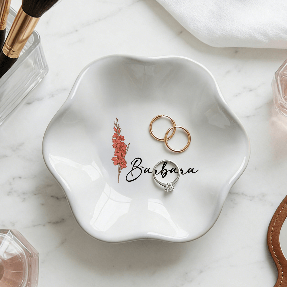 Inspiré par les doux contours des pétales naturels, ce plat à bijoux présente un motif de fleur de naissance à l'aquarelle aux lignes élégantes et aux tons chauds et apaisants. Chaque pièce peut être personnalisée avec un nom et la fleur du mois de naissance correspondant, alliant ainsi sentiment et style dans un accessoire unique conçu spécialement pour elle.