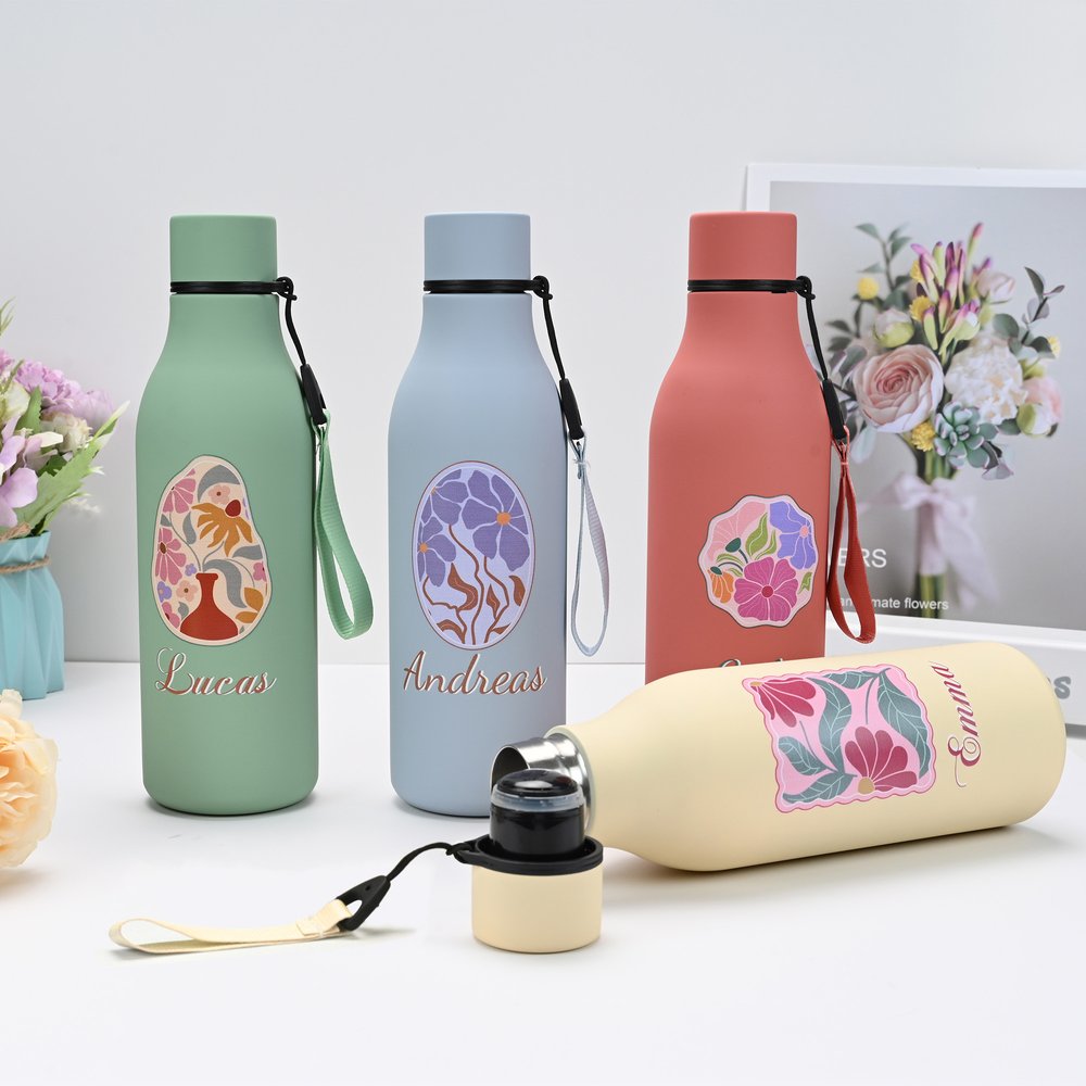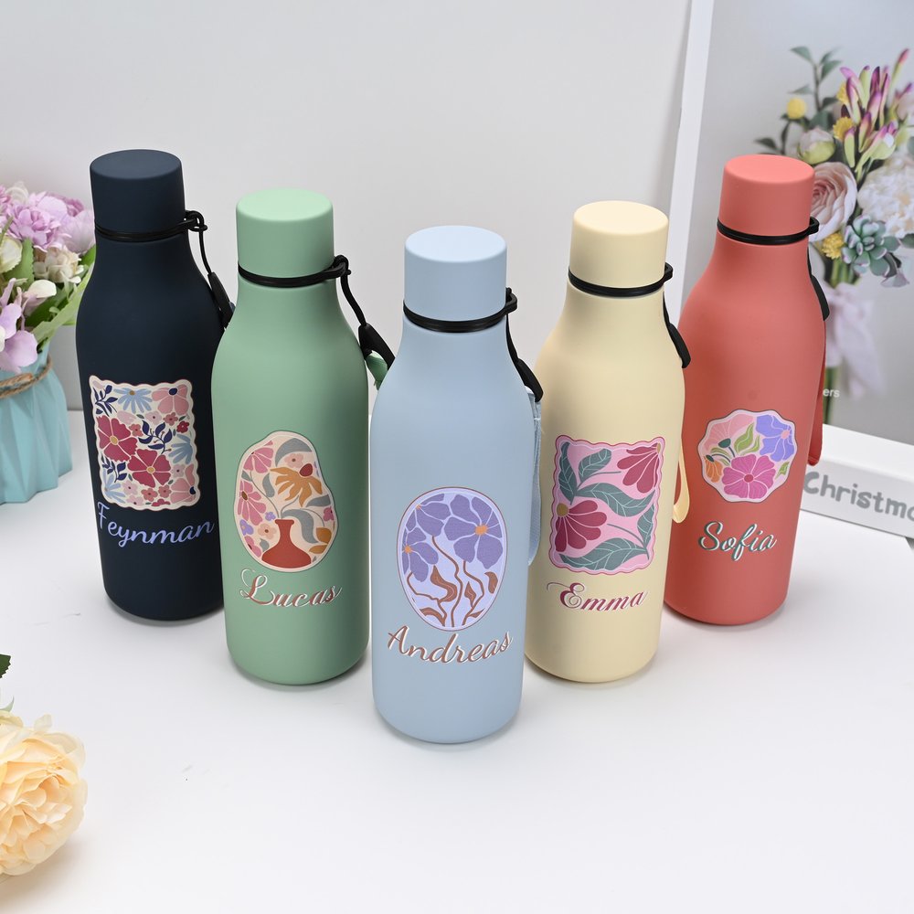 Nos bouteilles d'eau se déclinent en 9 couleurs sobres, avec une texture givrée qui incarne l'élégance. La bouteille présente un motif floral danois de style aquarelle avec une forme irrégulière de cadre ondulé, ce qui est créatif et artistique. Vous pouvez personnaliser votre nom pour créer un accessoire unique qui reflète votre style.