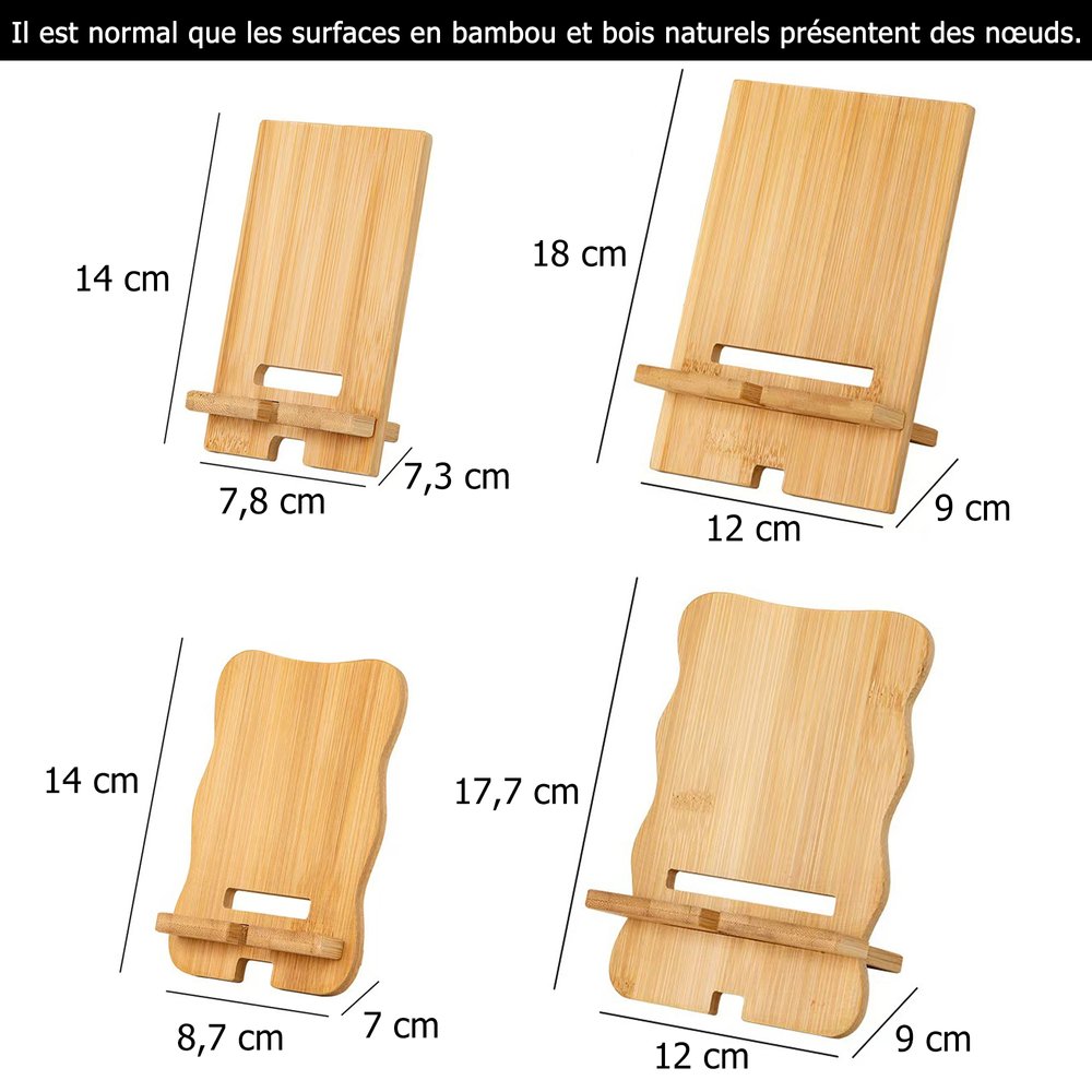 Fabriqué en bambou naturel, ce support est respectueux de l'environnement, lisse et robuste, et offre une excellente durabilité et des performances anti-chute. La structure amovible permet de le transporter et de le ranger facilement, tandis que l'épaisseur modérée garantit un support stable pour les téléphones et les tablettes. Des nœuds de bambou naturel peuvent apparaître à la surface, ce qui est une caractéristique normale du matériau et n'affecte pas l'utilisation ou l'apparence.