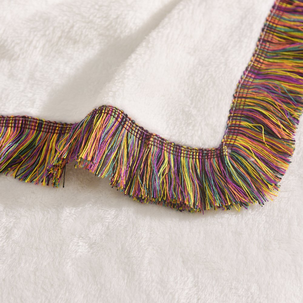 Les franges de cette couverture sont temporairement retenues par des points de couture. Avant utilisation, repérez les segments cousus le long des franges et coupez délicatement ces fils avec des ciseaux.