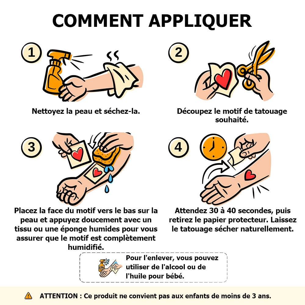 1. Nettoyez et séchez votre peau, découpez le motif du tatouage et retirez le film transparent. 2. Placez le tatouage face contre la peau, appliquez une serviette mouillée pendant 30 à 40 secondes, puis retirez délicatement le support. Laissez sécher à l'air libre. Évitez les crèmes ou huiles. 3. Pour le retirer, utilisez de l’alcool ou de l’huile pour bébé. 4. Ne pas appliquer sur une peau sensible, irritée, près des yeux ou sur une zone pileuse. Arrêtez l'utilisation en cas d'irritation. Ne convient pas aux enfants de moins de 3 ans.