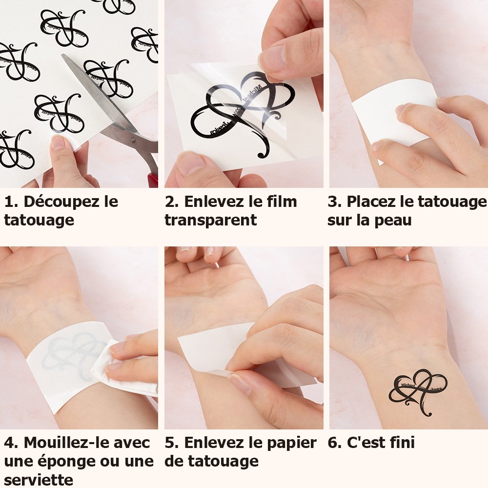 | Soins: | - Pour de meilleurs résultats, assurez-vous que votre peau est sèche et exempte d'huile, de lotion et de maquillage. - Choisissez une zone lisse et sans poils pour éviter les rides. - Évitez de mouiller le tatouage temporaire pendant au moins quelques heures après l'application. - Nos tatouages sont imperméables et ne s'enlèvent pas sous la douche ou dans la piscine. - Nos tatouages durent généralement de 3 à 8 jours. - Lorsque vous nettoyez la zone autour du tatouage, utilisez un savon doux et de l'eau. - Pour enlever le tatouage temporaire, frottez-le doucement avec des lingettes humides, du démaquillant pour les yeux, de l'huile pour bébé ou de l'alcool à friction. |