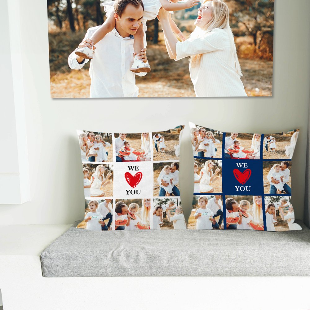 Les photos personnelles, associées au texte "WE LOVE YOU" et à l'élément "cœur", créent un style à la fois personnalisé et émotionnel. Les options de couleur permettent de l'assortir à différents styles de décoration, ce qui en fait un objet polyvalent qui s'intègre parfaitement à l'espace de vie.