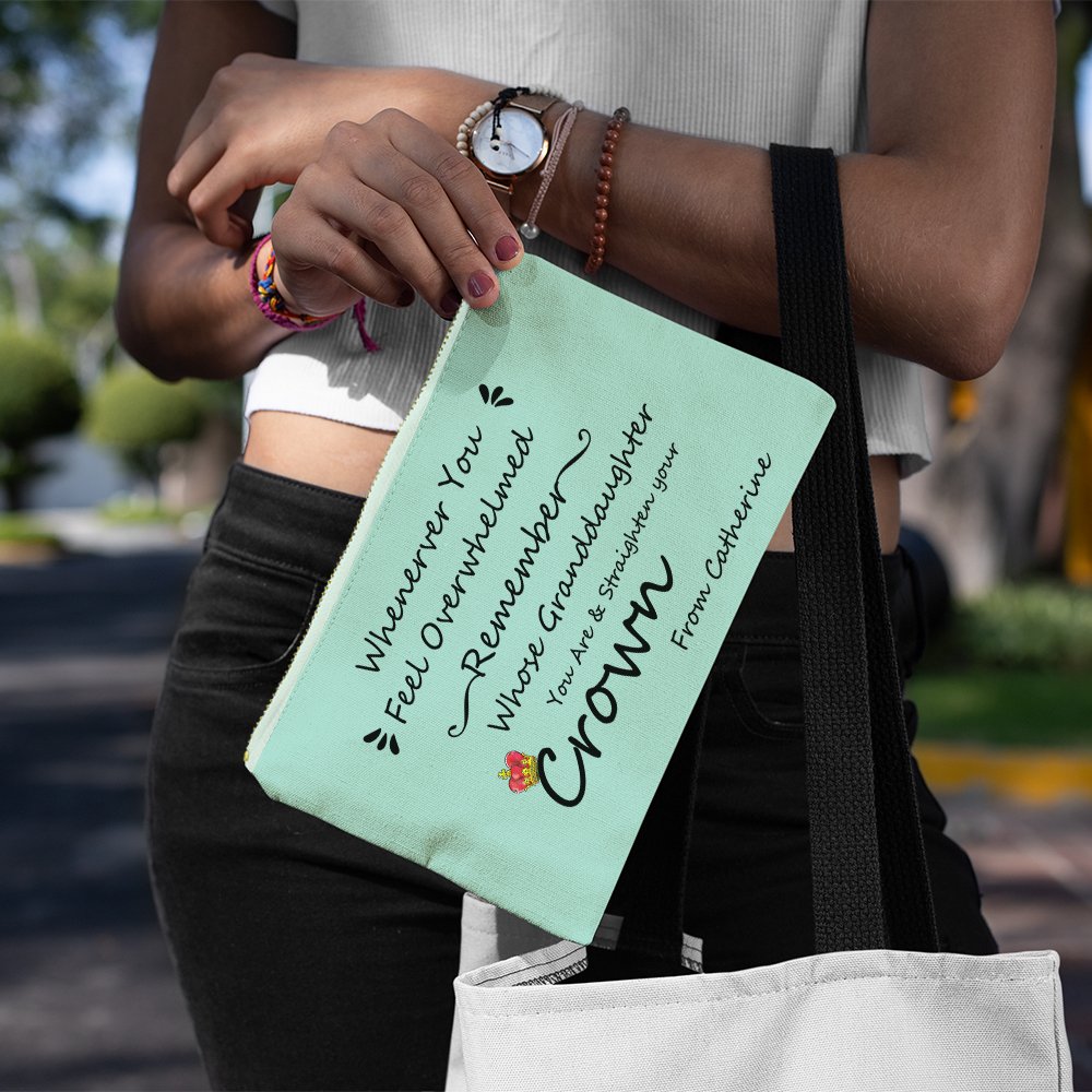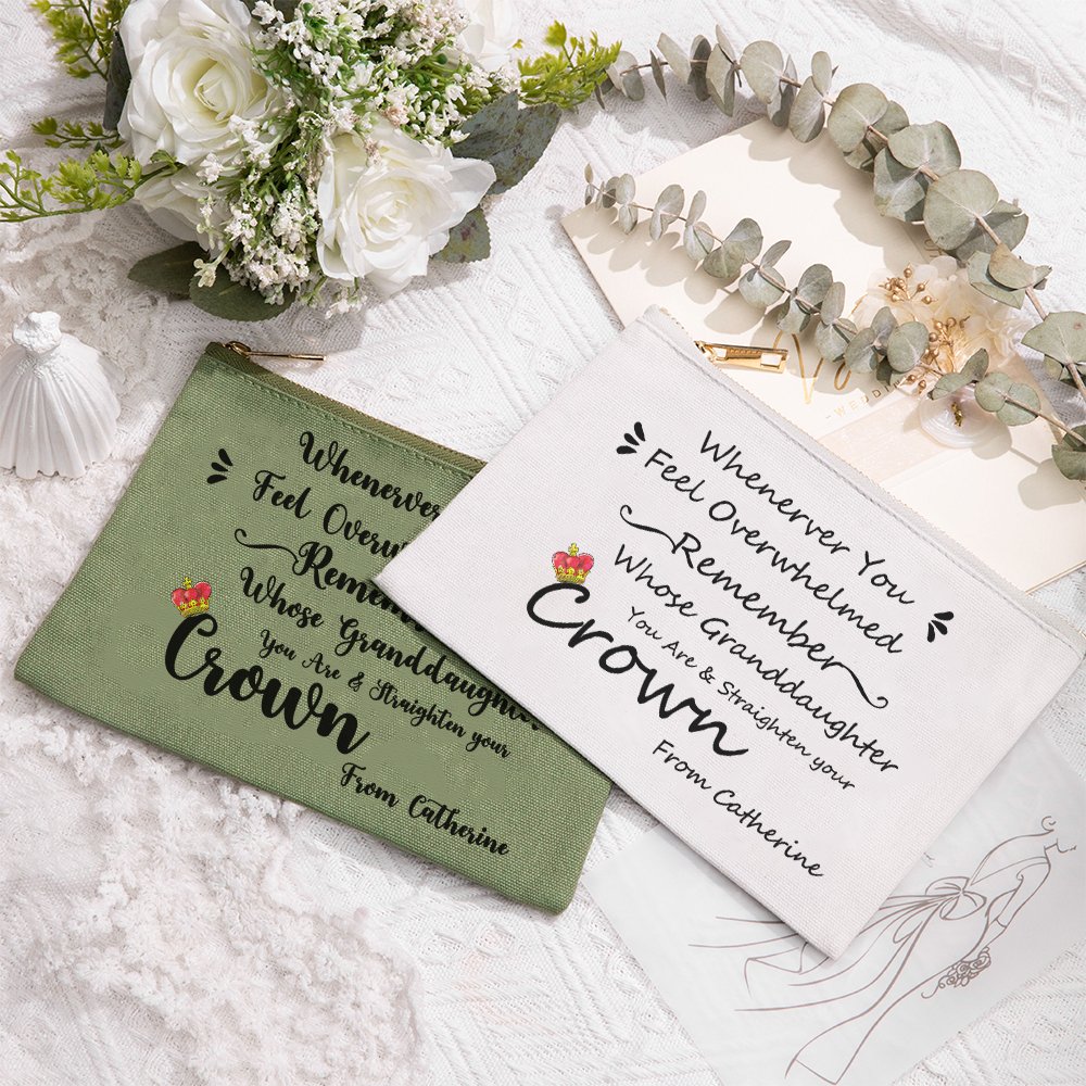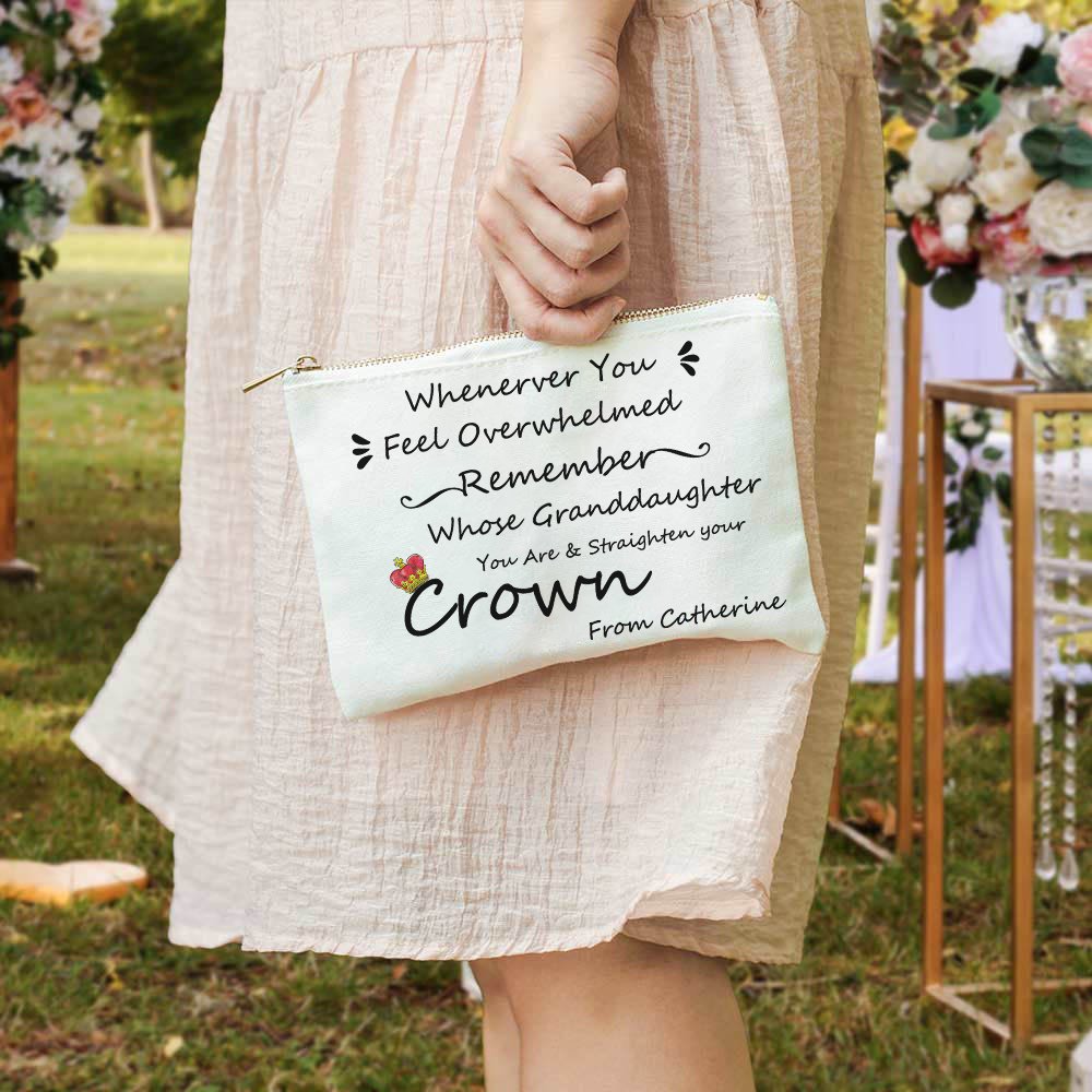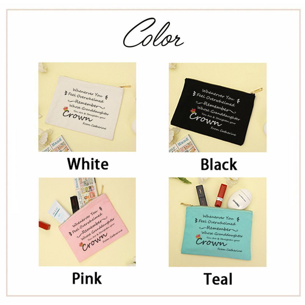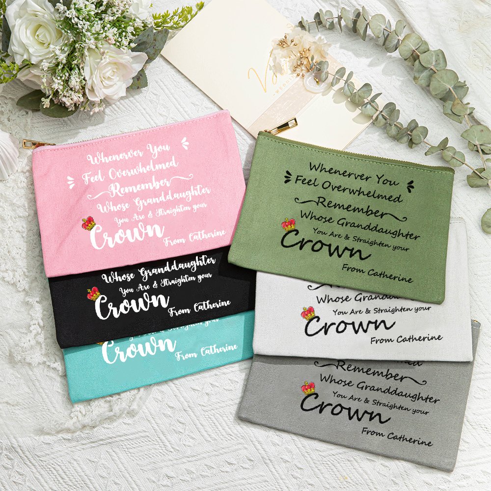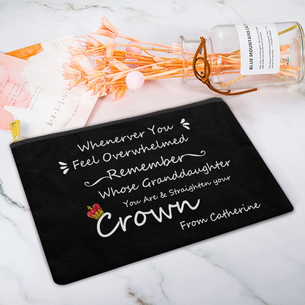 Cette trousse à cosmétiques porte la phrase "Chaque fois que vous vous sentez dépassée, souvenez-vous de qui vous êtes la fille/petite-fille et redressez votre couronne", ce qui montre que vous avez de bons souhaits pour votre fille ou petite-fille. Vous avez le choix entre 4 couleurs.