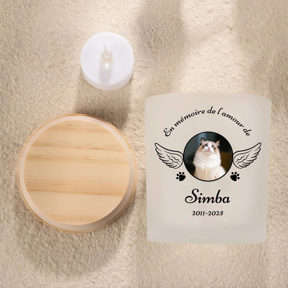 Ce photophore commémoratif combine astucieusement d'adorables empreintes de pattes et d'ailes avec un message commémoratif, capturant délicatement l'amour durable de votre animal de compagnie. Il vous suffit de télécharger une photo de votre animal et de personnaliser son nom, sa date et son titre, et nous imprimerons méticuleusement ces précieux éléments sur le photophore. Laissez les souvenirs chaleureux de votre ami à fourrure s'écouler à travers la lumière et l'ombre.