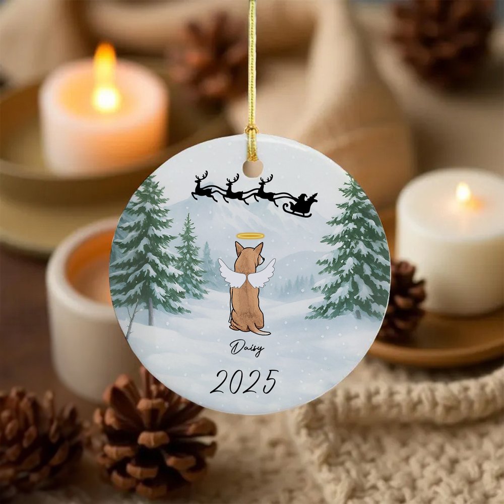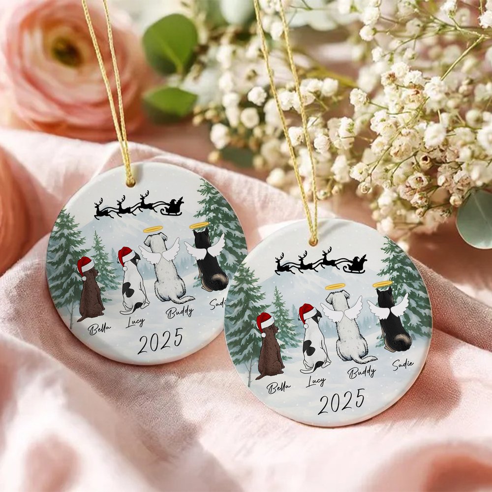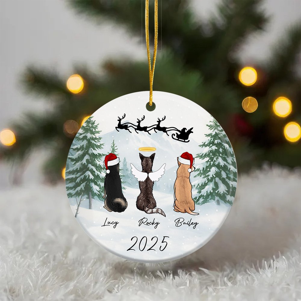 Cet ornement en céramique représente un doux paysage enneigé gris-blanc parsemé de pins, capturant la beauté tranquille d'un paysage hivernal. Le renne de Noël dans le ciel ajoute une touche festive. Personnalisez l'ornement avec un à quatre chiens, en ajoutant des bonnets ou des ailes de Père Noël, ainsi que des noms pour une touche personnalisée qui plaît aux propriétaires d'animaux de compagnie.