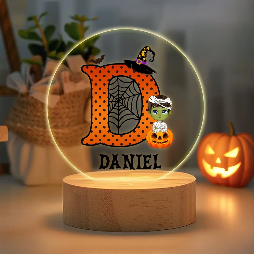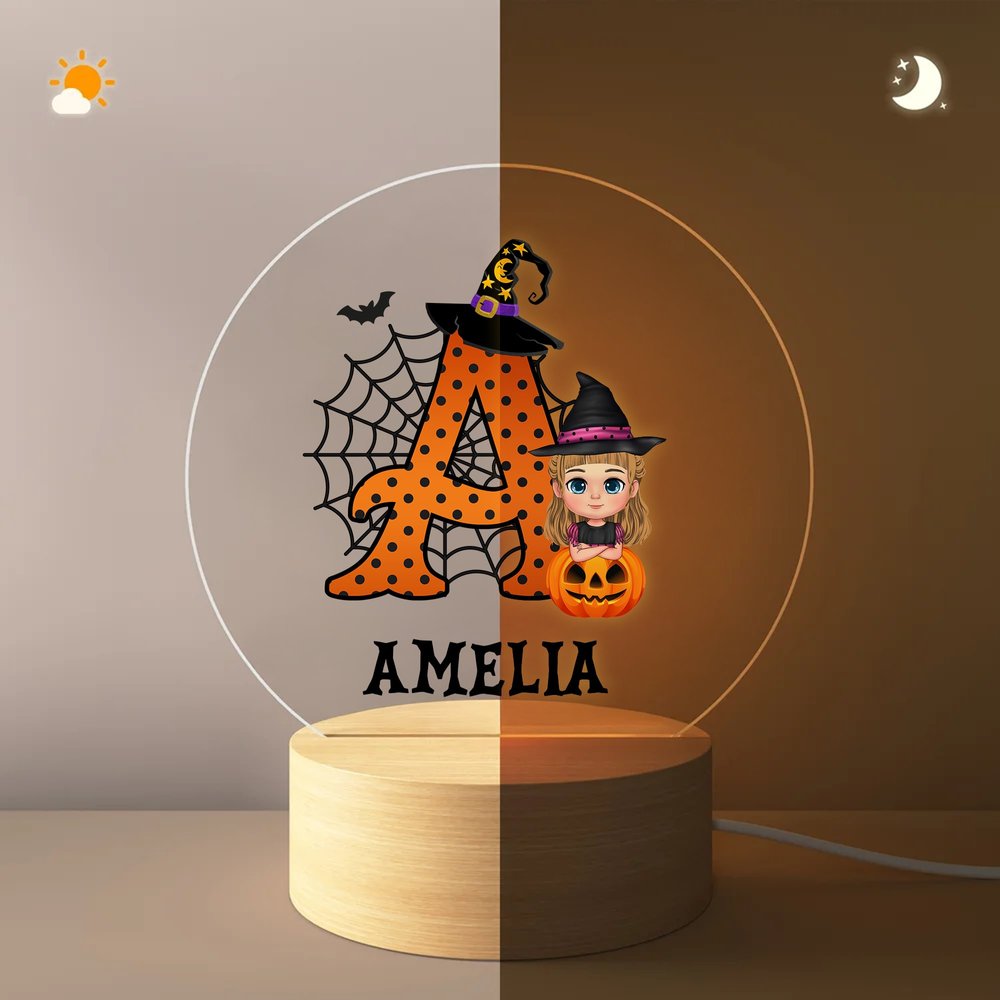 Veilleuse LED Personnalisée Chapeau de Sorcière Citrouille Personnage Cartoon avec Base en Bois Nom et Initiale Cadeau d'Halloween pour Garçons Filles