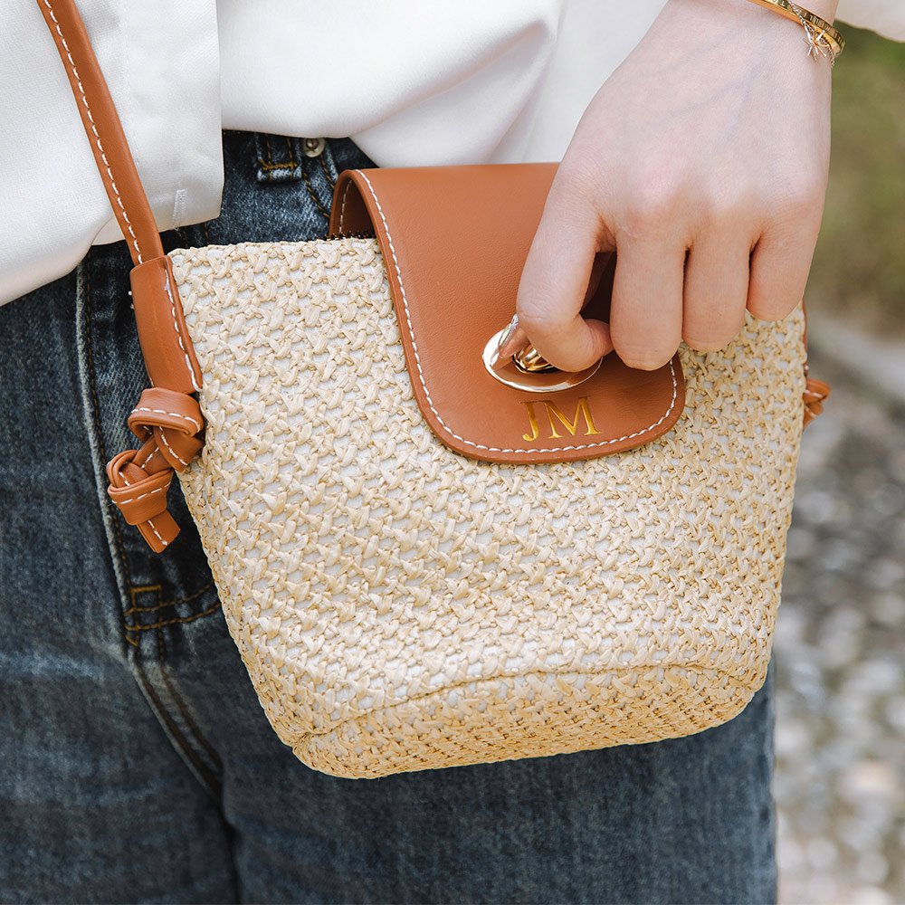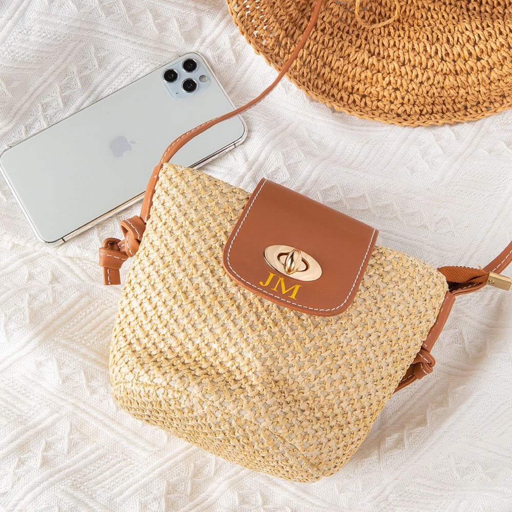 Sac de Paille Personnalisé avec Monogramme Sac avec Bandoulière en Cuir Accessoire de Voyage Vacances d'Été à la Plage Cadeau pour Femme