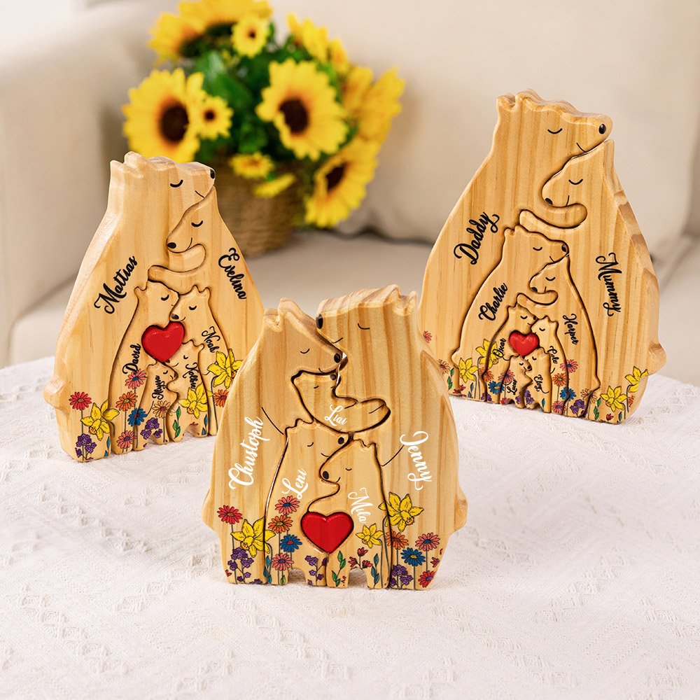 Ce puzzle en bois représente des ours qui se serrent l'un contre l'autre avec un cœur rouge au milieu, symbolisant une famille aimante. Vous pouvez personnaliser de 2 à 8 ours, chacun portant un nom qui vous rappellera l'amour et le soutien qui permettent à votre famille de rester unie dans les bons comme dans les mauvais moments.