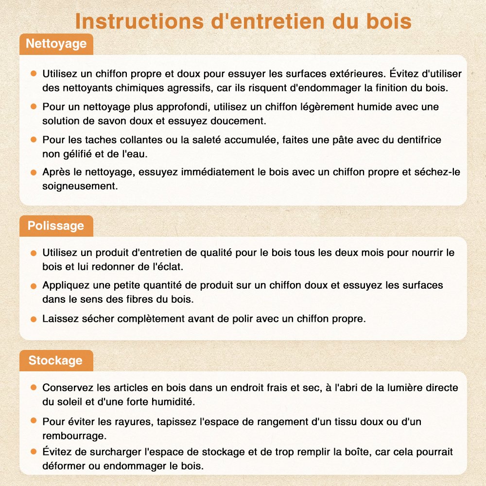 | Soins: | - Utilisez un chiffon propre et doux pour essuyer les surfaces extérieures. Évitez d'utiliser des nettoyants chimiques agressifs, car ils peuvent endommager la finition du bois. - Utilisez tous les deux mois un produit d'entretien de qualité conçu pour le bois afin de nourrir le bois et de lui redonner de l'éclat. - Conservez les objets en bois dans un endroit frais et sec, à l'abri de la lumière directe du soleil et d'une forte humidité. |