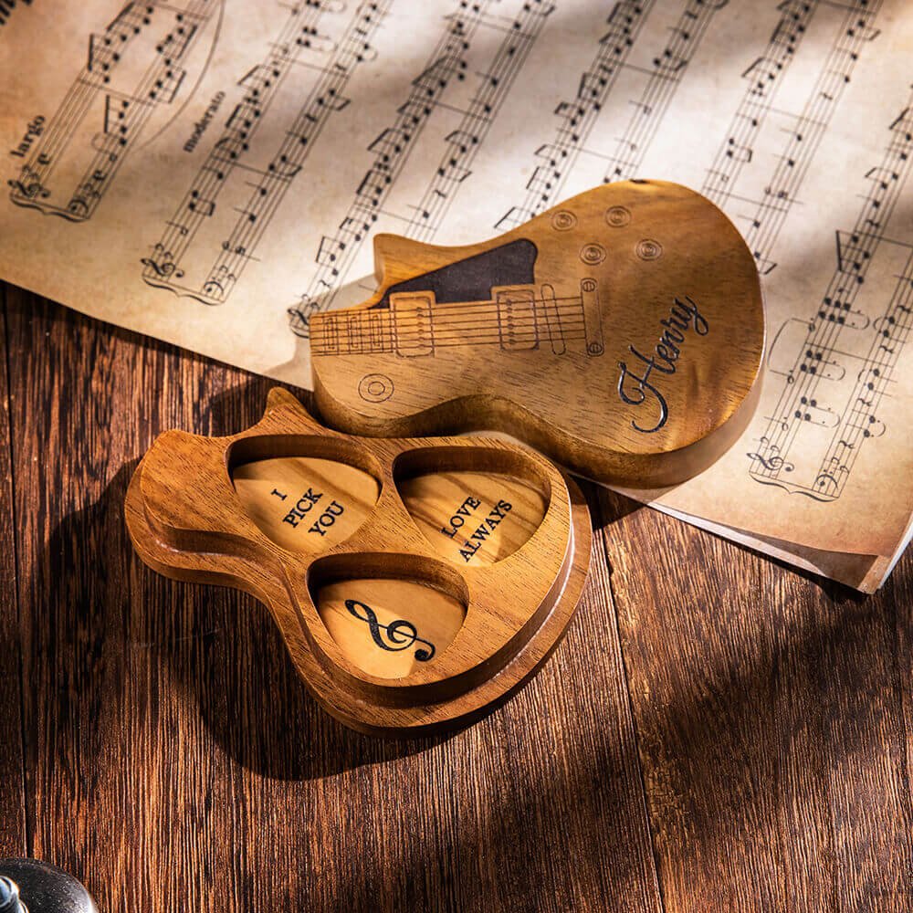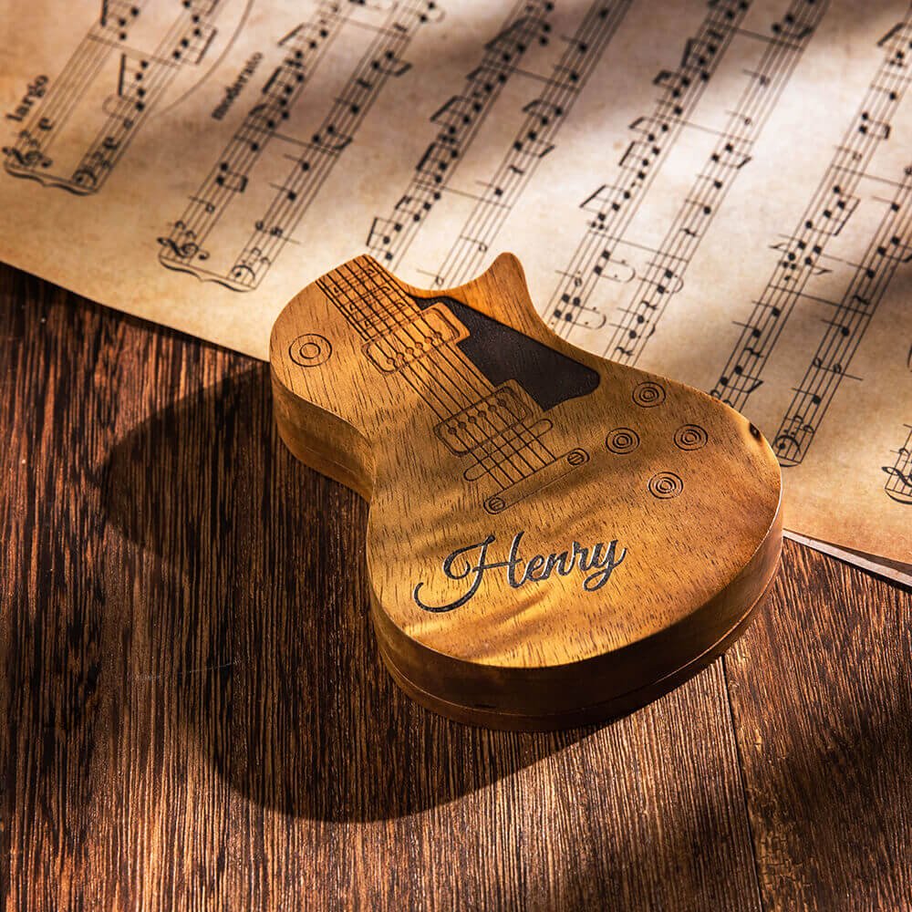 Pour compléter ces choix exceptionnels, nous avons inclus un étui de rangement élégant gravé d'un motif assorti. Cet étui permet non seulement de garder les médiators en sécurité et organisés, mais sert également de pièce décorative qui peut être fièrement exposée. La combinaison des médiators personnalisés et de la boîte de support gravée crée un ensemble cohérent et visuellement attrayant que tout guitariste sera fier de présenter.