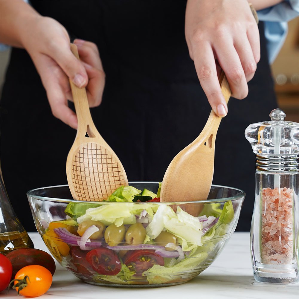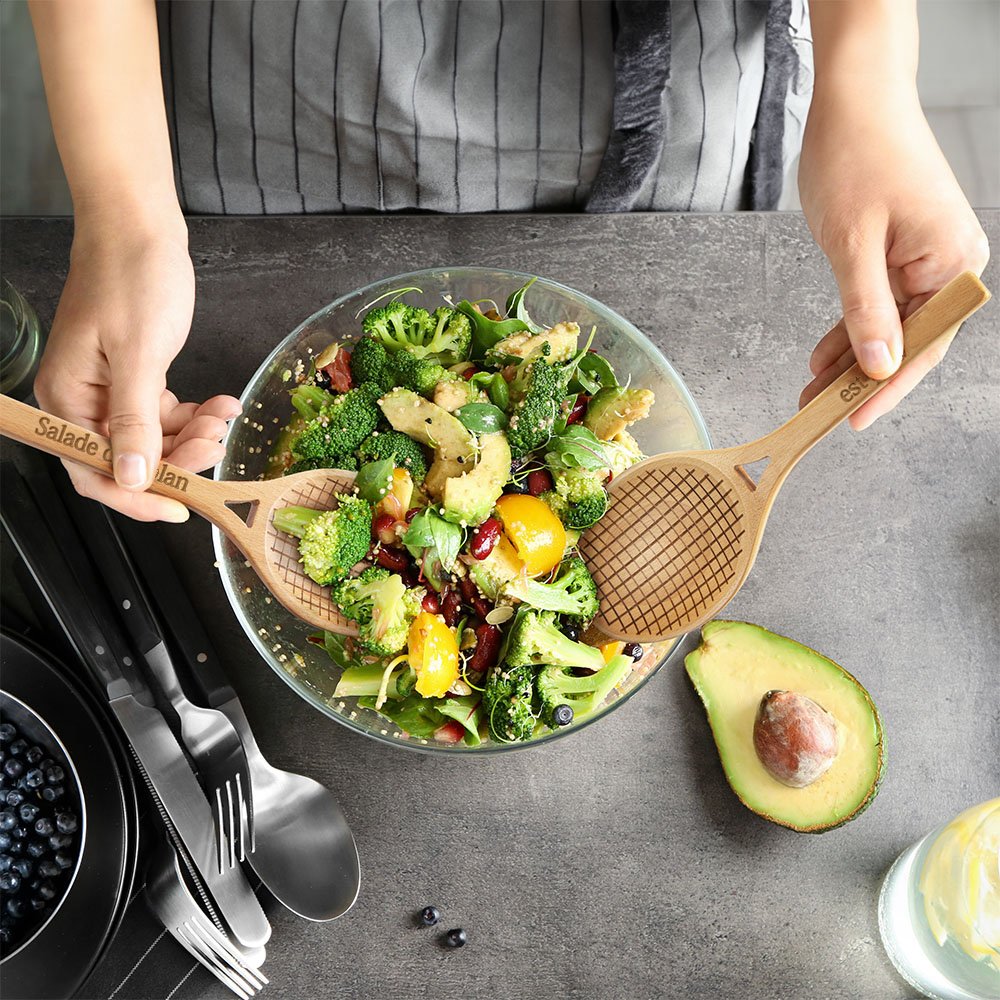 2 cuillères sont incluses dans chaque set. Fabriquées en bois de hêtre, elles sont agréables au toucher, durables et faciles à nettoyer. Les cuillères en bois naturel sont non toxiques et peuvent entrer en contact direct avec la nourriture. Le processus de gravure au laser permet de faire apparaître clairement le contenu personnalisé. Le long manche est conçu pour une prise en main plus ferme, ce qui vous permet de mélanger et de déguster votre salade plus facilement. Convient à la plupart des saladiers.