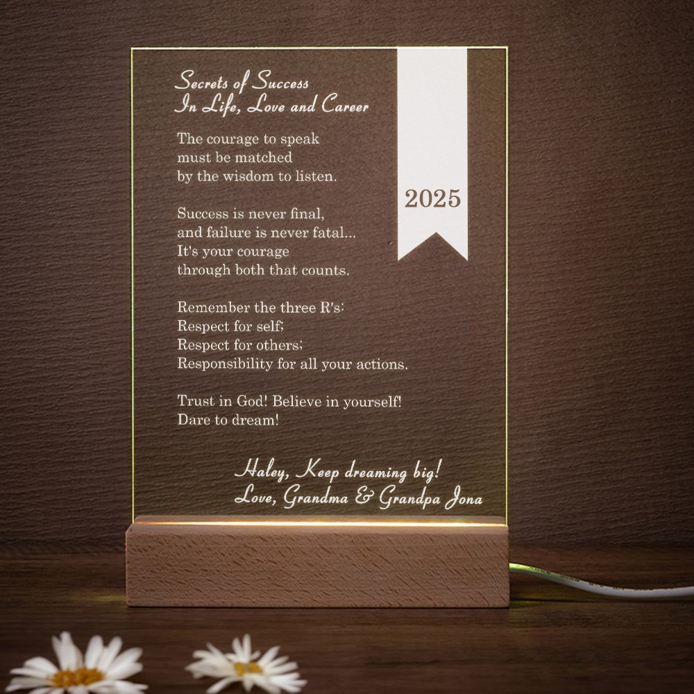 Notre veilleuse LED personnalisée exclusive est le cadeau idéal pour tout diplômé. Avec la possibilité d'ajouter deux lignes de remarques finales sincères et une année significative, cette veilleuse personnalisée sera chérie aujourd'hui et pour toujours. Le texte "Secrets of Success In Life, Love and Career..." est imprimé sur la plaque.