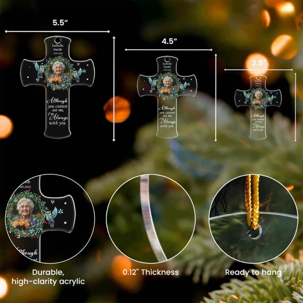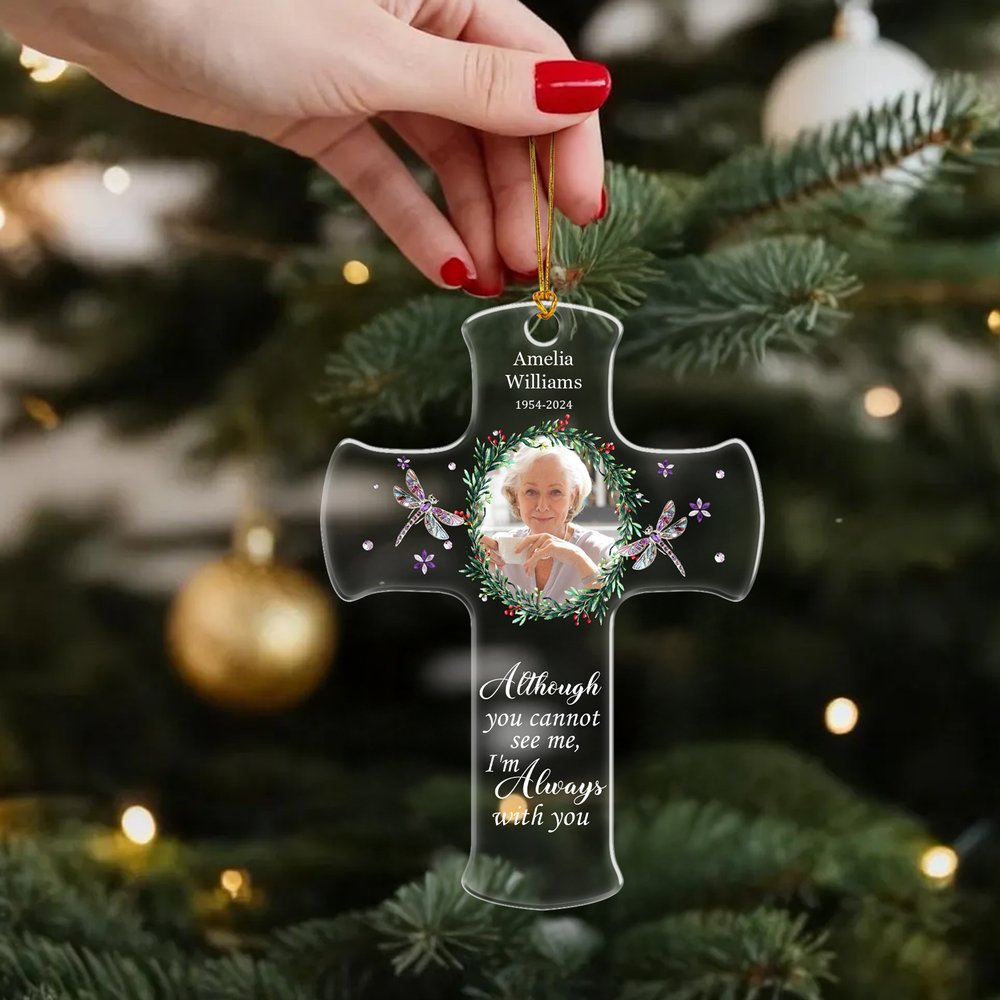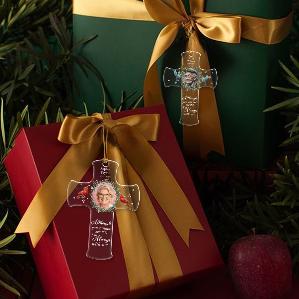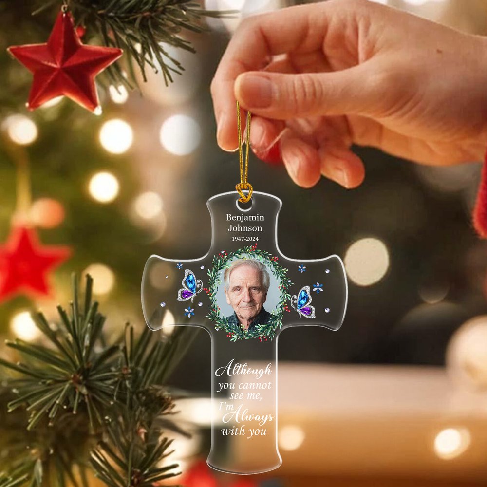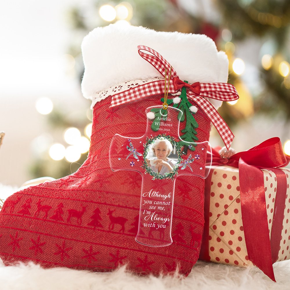 Cet ornement exquis en acrylique a la forme d'une croix, avec la photo d'un être cher entourée d'une couronne de houx, entourée d'éléments décoratifs tels que des cardinaux, des papillons, des hiboux et des libellules. La personnalisation de votre précieuse photo vous permet d'ajouter son nom et ses dates de naissance et de décès, ce qui en fait un hommage profondément émouvant à l'être cher.