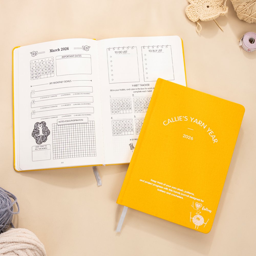 Calendrier personnalisé des pelotes de laine 2026 Journal A5 avec texte et page de planification de projet Accessoires de rangement pour le crochet Cadeau d'anniversaire pour les amoureux du tricot
