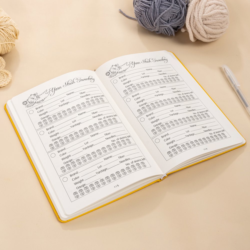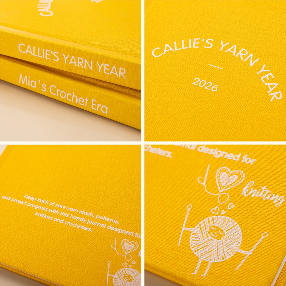 Le jaune vif est la couleur principale, le coin inférieur droit de la couverture représentant une pelote de laine, un modèle d'outil de tricot en forme de cœur et le mot "tricot". Le millésime 2026 ajoute une valeur commémorative exclusive, tandis que le texte fonctionnel souligne "Gardez une trace de votre réserve de fil, de vos modèles et de l'avancement de vos projets grâce à ce journal pratique conçu pour les tricoteuses et les crocheteuses". Le texte personnalisable sur la couverture et le dos allie harmonieusement l'utilité et l'esthétique.