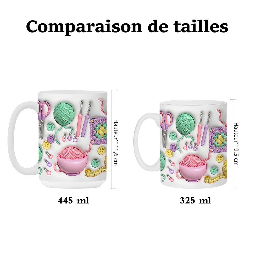 Ce mug donne vie au charme du tricot grâce à des éléments visuels tridimensionnels - pelotes de laine colorées, crochets, ciseaux et boutons - tous rendus dans des teintes douces et rafraîchissantes. Personnalisable avec un nom et disponible en 325 ml ou 445 ml, ce mug allie harmonieusement la chaleur de l'artisanat à la fonctionnalité de tous les jours, transformant chaque mug en un emblème personnel pour les passionnés de tricot. Plus qu'un simple récipient pour les boissons, il s'agit d'un souvenir sincère qui célèbre un hobby bien-aimé.