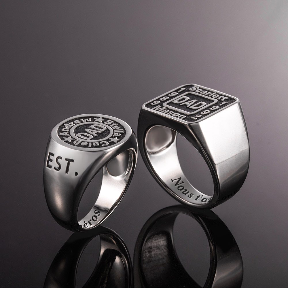 • Un type rond et un type carré au choix, choisissez le mieux pour votre père. Type carré plus masculin, le type rond avec un ton plus doux. Quel genre de personnalité est votre papa ? Personnalisez sa bague cadeau maintenant !