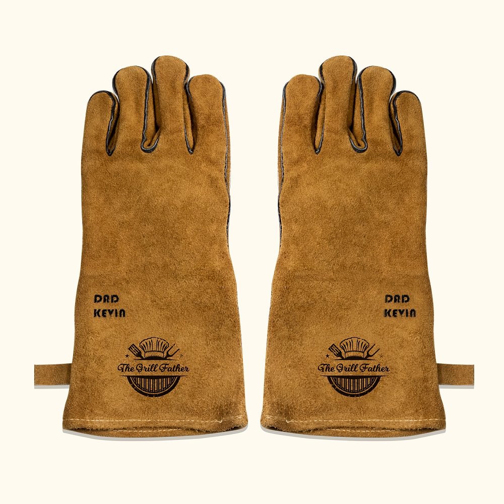 Les gants de barbecue allient style et fonctionnalité, avec la phrase ludique "LE PÈRE DU GRILL". Disponibles en quatre modèles distincts, ces gants peuvent être personnalisés avec le nom de votre père, ce qui en fait un cadeau unique qui met en valeur sa personnalité pendant qu'il cuisine.