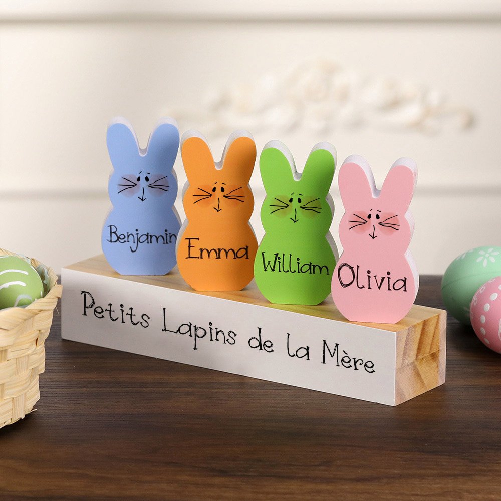 Célébrez la joie de Pâques avec notre charmant ensemble de blocs en bois de lapins de Pâques, un ajout unique et réconfortant à votre décoration intérieure. Avec ses six couleurs vibrantes, chaque lapin ajoute une touche de couleur et de charme à votre espace. Avec la possibilité de personnaliser jusqu'à 15 lapins et noms, vous pouvez créer une présentation unique qui raconte l'histoire de votre famille.